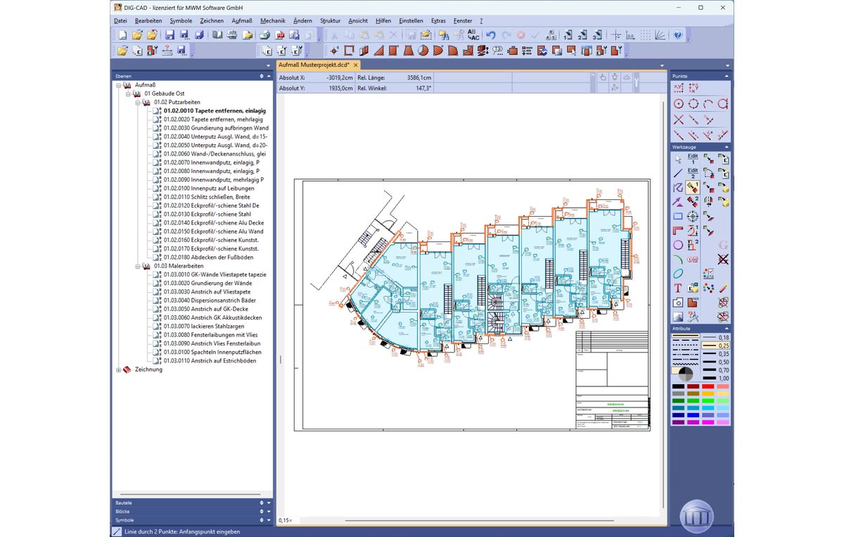 Darüber hinaus ist es nun möglich, direkt aus einem grafischen Aufmaßobjekt im CAD-Plan in die zugehörige Abrechnungszeile zu wechseln. Zuvor war dieser Schritt ausschließlich vom Aufmaßdatensatz in der Abrechnung in Richtung Plan möglich. Zusätzlich können Ebenen und Ebenenverzeichnisse auf Basis der Leistungsverzeichnis-Struktur von MWM-Libero automatisch angelegt werden.