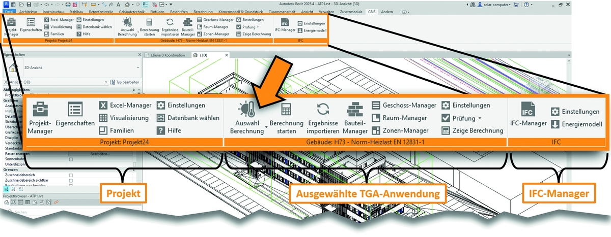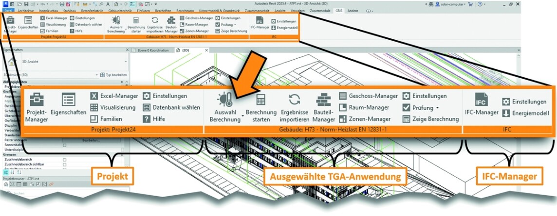 Die neue Ribbonbar bildet die Ablauflogik typischer Gebäude- und TGA-Anwendungen ab. Via „Auswahl Berechnung” kann die Oberfläche auf die gewünschte Rechenanwendung umgeschaltet werden. Im Hintergrund aktiviert GBIS automatisch die passende Integration. Für Revit-Workflows ist der Prozess nahtlos und bidirektional ausgelegt: BIM-Modell und Rechenmodell arbeiten Hand in Hand, und zwar vom Aufbau über die normkonforme Berechnung (z.B. Normenentwurf DIN EN 12831-1) bis hin zur vollständigen Rückübertragung der Ergebnisse in das Revit-Modell.
