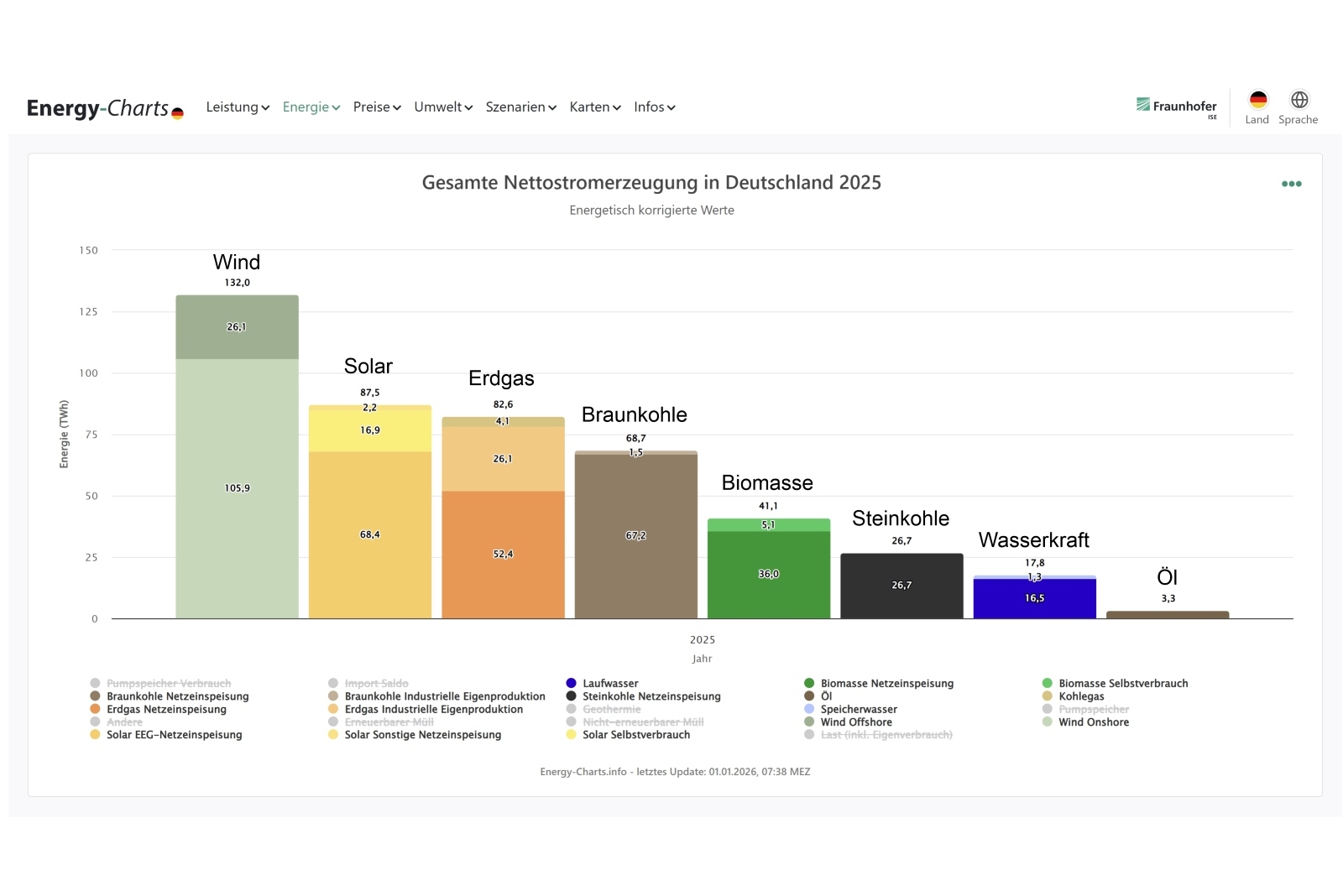 (2.1.2026) Laut Angaben des Fraunhofer-Institut für Solare Energiesysteme (ISE) haben 2025 erneuerbare Energien erneut 55,9 % des deutschen Strommixes gestellt. Dabei blieb Windkraft die wichtigste Quelle, Photovoltaik überholte erstmals die Braunkohle. Das geht aus einer Auswertung hervor, die das Fraunhofer ISE am 2. Januar 2026 vorgelegt hat. Quelle der Daten ist die Plattform energy-charts.info