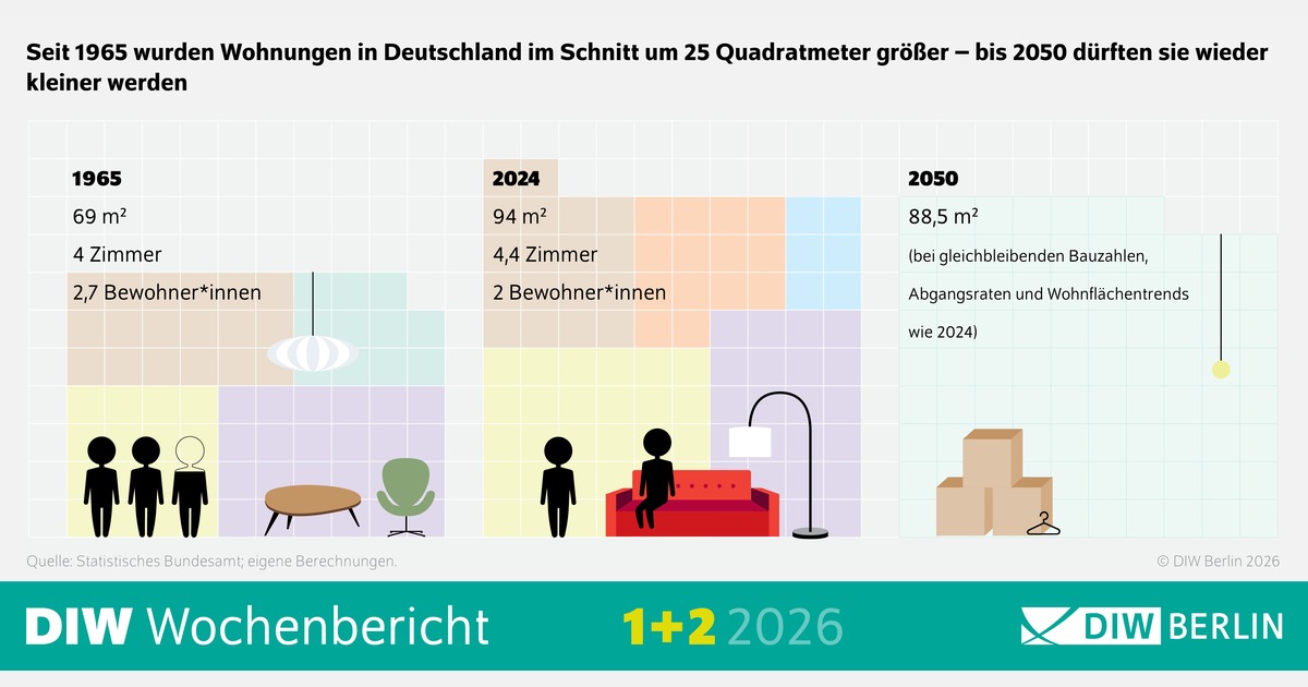 Seit dem Jahr 1965 wuchs die Wohnungsgröße von 69 m² auf 94 m². Parallel dazu hat sich die Wohnfläche pro Person von knapp 20 m² auf gut 49 m² mehr als verdoppelt. Allerdings wurden die Neubauwohnungen seit dem Jahr 2005 wieder kleiner. Dies macht sich nun im Bestand bemerkbar und bis 2050 dürfte die durchschnittliche Wohnung etwa 6 m² kleiner sein als heute. Zu diesen Ergebnissen kommt eine aktuelle Studie des Deutschen Instituts für Wirtschaftsforschung (DIW Berlin) nach Auswertung amtlicher statistischer Daten.