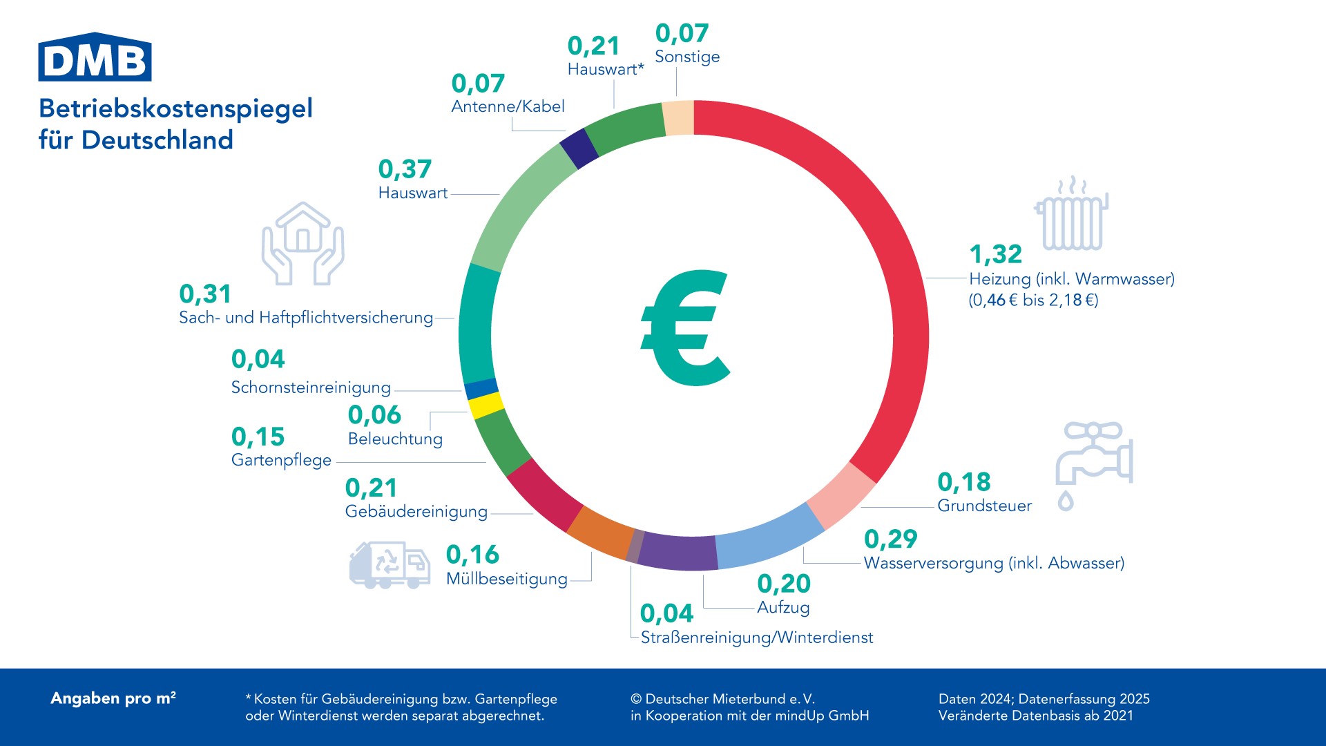 - Heizung und Warmwasser 1,32 Euro (Bandbreite 0,46 – 2,18 Euro)