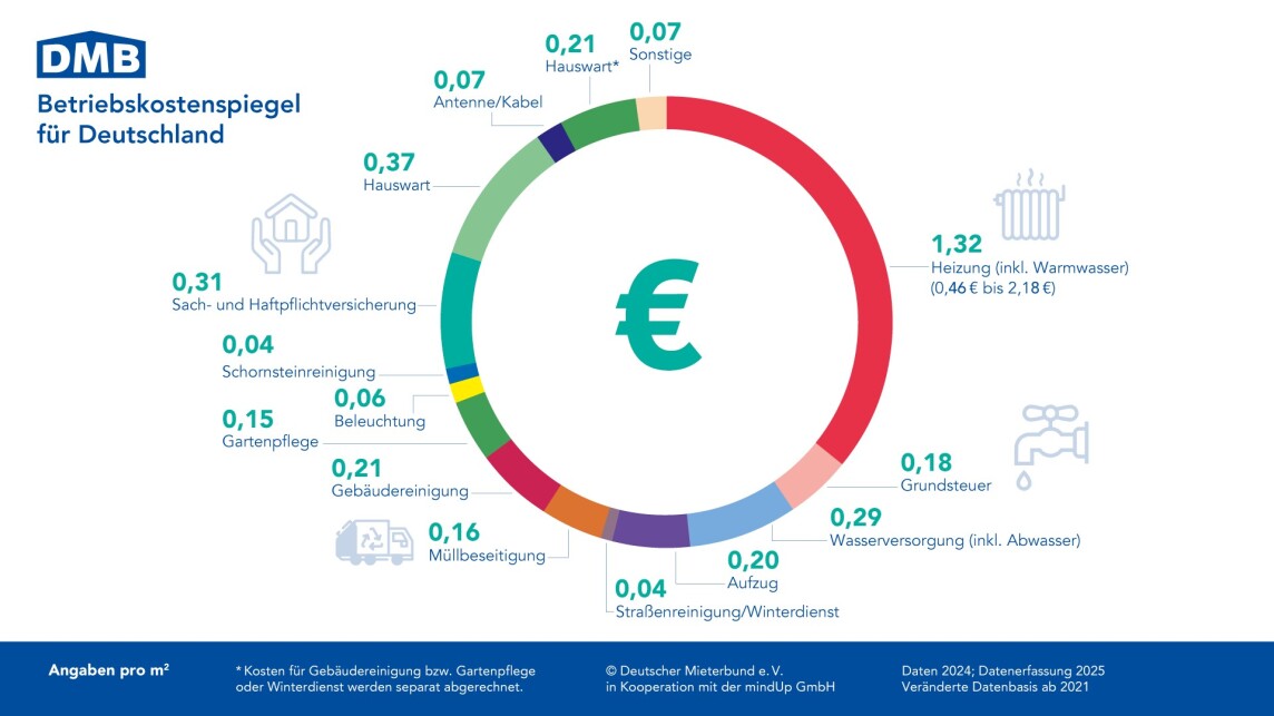 (13.1.2026) Der Betriebskostenspiegel 2024 des Deutschen Mieterbundes weist für Deutschland durchschnittliche Betriebskosten von 2,67 Euro pro Quadratmeter und Monat aus. Gegenüber dem Vorjahr entspricht das einem Anstieg von mehr als 6 %. Werden alle umlagefähigen Kosten berücksichtigt, kann die sogenannte zweite Miete bis zu 3,68 Euro pro Quadratmeter und Monat betragen.