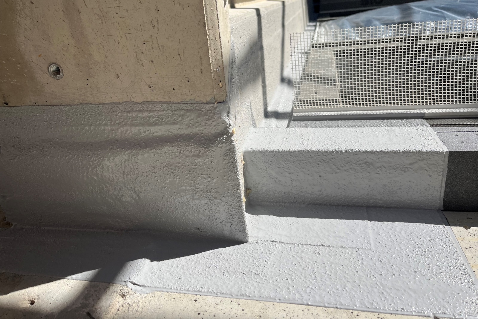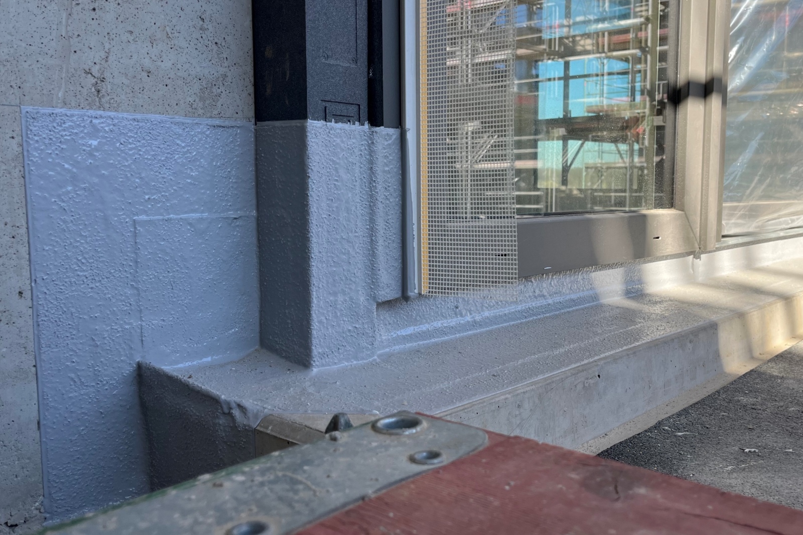 Die Abdichtung der Anschlüsse auf den Balkonflächen erfolgte ohne den Einsatz von Grundierungen, direkt auf den fachgerecht vorbereiteten Betonuntergrund. Die erste Schicht wurde in Telegrau ausgeführt, danach folgte das blasenfreie Einlegen eines Polyestervlieses und der Auftrag der zweiten Lage. Für die Verarbeitung bei tieferen Temperaturen diente der Frankosil Turbo Shot als Zusatz, wodurch das System innerhalb von etwa 90 Minuten aushärtete. Das ermöglichte einen unterbrechungsfreien Arbeitsfortschritt auch in den kühleren Bauphasen und reduzierte wartebedingte Stillstandzeiten erheblich.