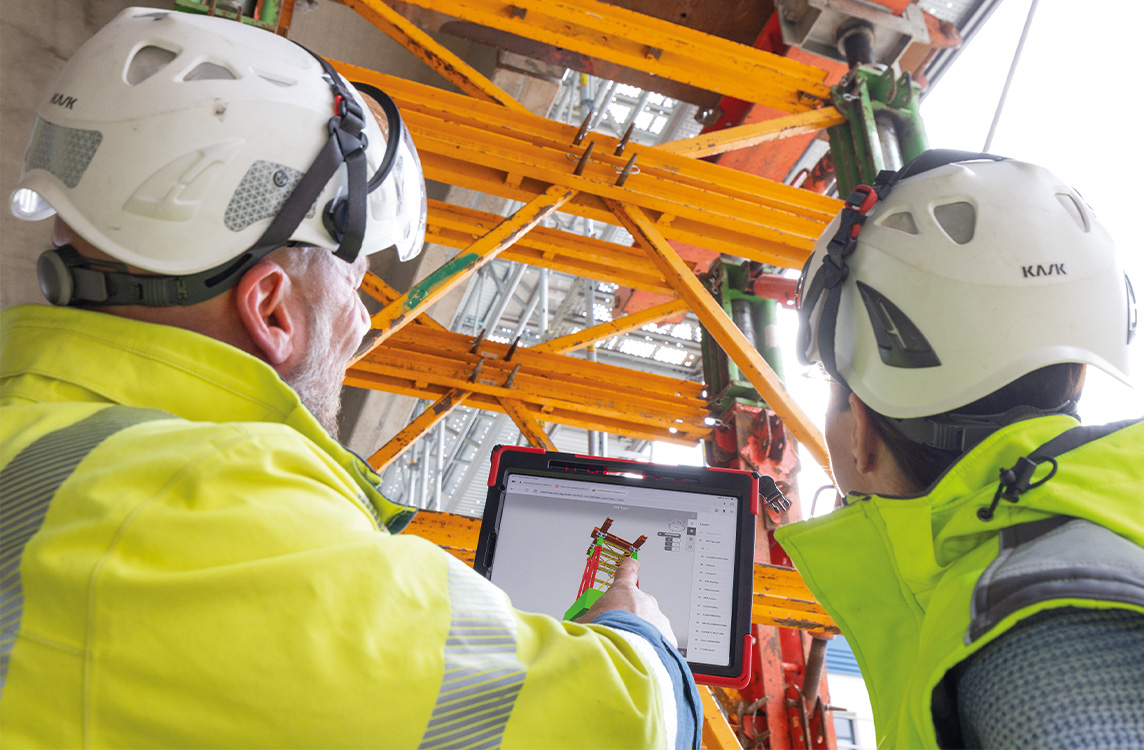 Ein weiterer praktischer Vorteil zeigte sich in der Nutzung der PERI Extended Experience App (XR): Die 3D-Gerüstplanung war in der jeweils aktuellen Version auf Tablet oder Smartphone verfügbar, sodass jede Detaillösung aus beliebiger Perspektive visualisiert werden konnte — eine Unterstützung, die die Gerüstmontage durch das A&U-Gerüstbauteam deutlich erleichterte.