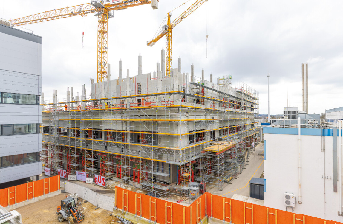 Im BioDS-Projekt kamen ein PERI UP Fassaden- sowie Arbeitsgerüste innerhalb zweier Versorgungsschächte zum Einsatz — sowohl zur Absturzsicherung während der Rohbauarbeiten als auch als Zugang zur Dachebene. Ergänzt wurde die PERI UP Lösung durch hochtragfähige VST-Lasttürme des Variokit Ingenieurbaukastens, die an zwei Gebäudeseiten die knapp 4 m auskragenden Geschosse temporär abfingen und die Lasten im Bauzustand sicher nach unten ableiteten.