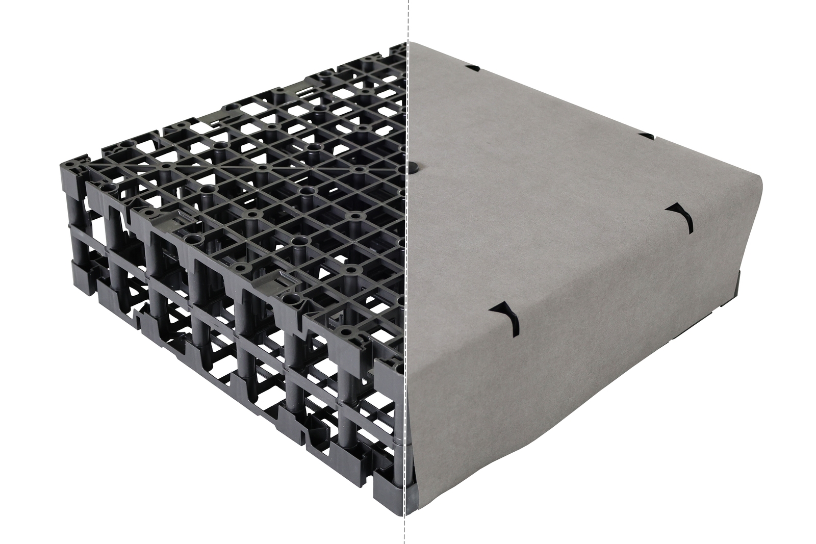 Der HydroSpacer HS 170 ist mit einem hochkapillaren Vlies ummantelt. Das Vlies wird bei der Verlegung der Spacer an allen vier Seitenflächen bis zur Unterkante geführt. Beginnt sich Wasser in den Spacern zu stauen, saugt das Vlies dieses an den Kontaktflächen auf und transportiert es durch die Kapillarwirkung nach oben. Je nach Anstauhöhe können damit bis zu 11 Liter Wasser pro m² vom Vlies aufgenommen und in der Folge an die darüberliegende Substratschicht abgegeben werden. Pflanzenwurzeln werden immer genau so viel Wasser aufnehmen, wie sie gerade benötigen – eine naturnahe Funktionsweise.