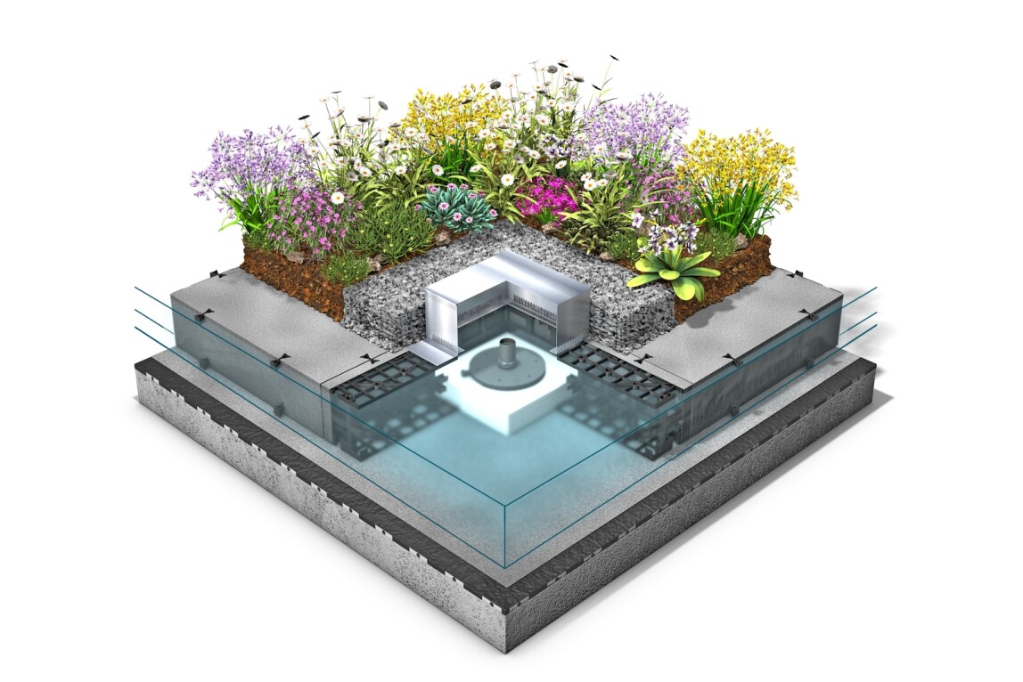 Zudem ist die Struktur bis zu 50 Tonnen pro m² belastbar und für Geh- und Fahrbeläge geeignet sind. Der längerfristige, pflanzenverfügbare Wasseranstau mit rund 8 cm findet im unteren Bereich des Spacers statt. Er wird mit Anstauscheiben realisiert, die unter der Retentionsdrossel liegen. Wird in Regenfällen weiter eingestaut – möglich sind weitere maximal 8,5 cm – fließt dieses Wasser über die Drossel sukzessive in den Dachablauf beziehungsweise im Idealfall in nachgeschaltete Zisternen.