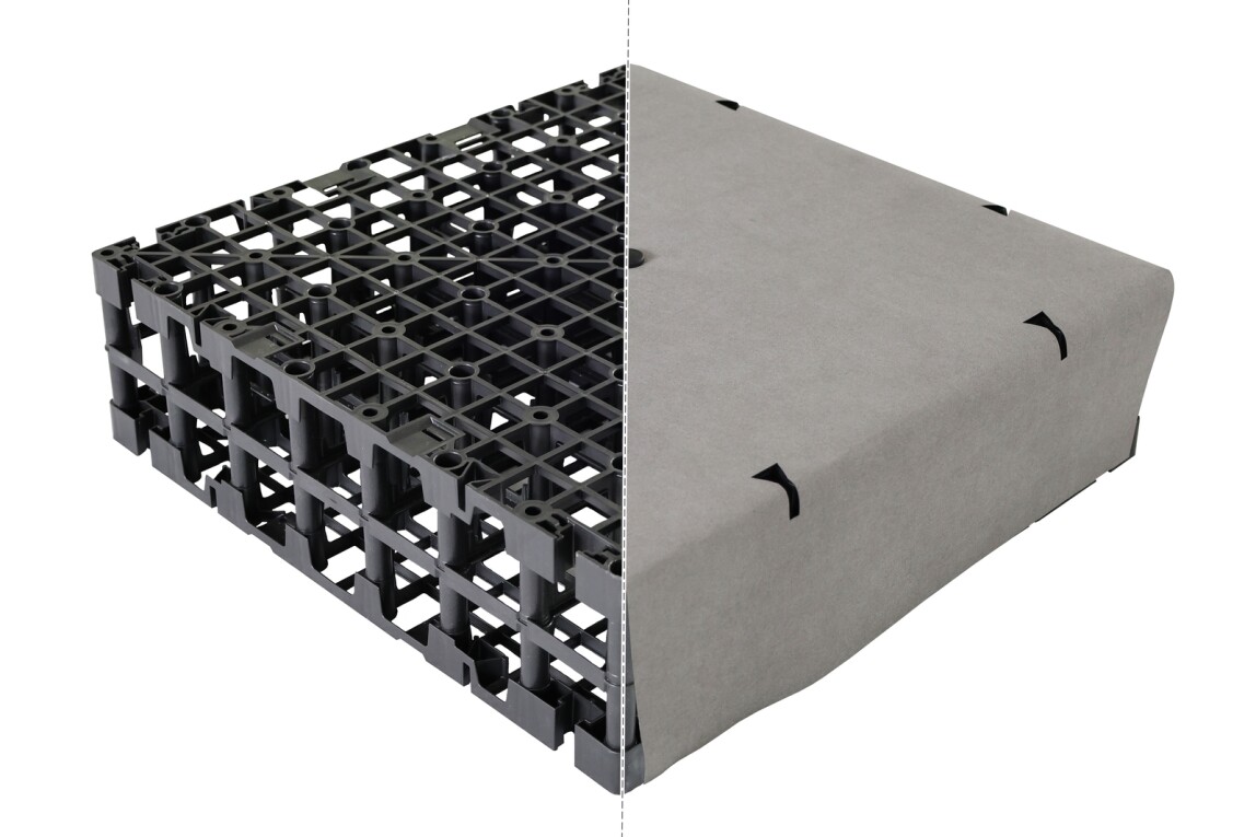 Der Wasseranstau im Zinco-Systemaufbau „Sponge City Roof” bedingt ein gefälleloses und fachgerecht abgedichtetes Dach. Die 60 x 60 cm großen und 17 cm hohen Elemente des HydroSpacer HS 170 aus Polypropylen verfügen über einen Hohlraumanteil von rund 95%, so dass diese bis zu 160 Liter Wasser pro m² aufnehmen können.