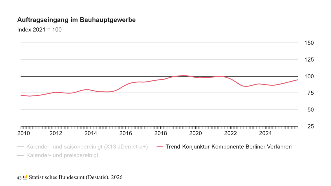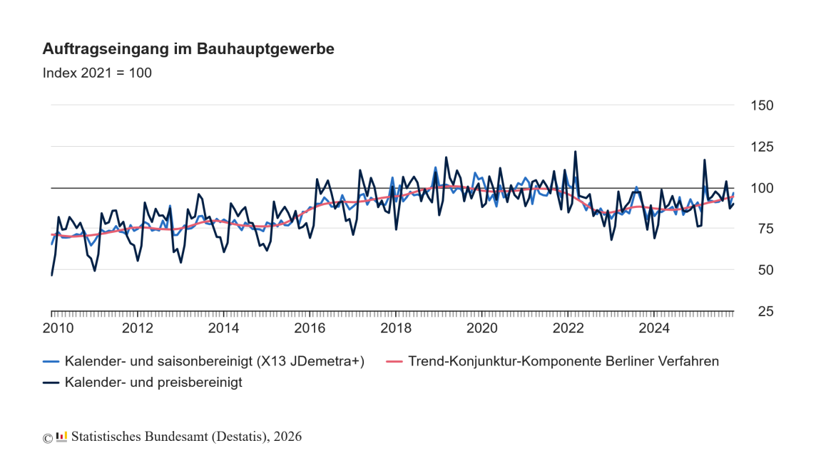 (23.1.2026) Wie das Statistische Bundesamt aktuell mitteilt, ist im November 2025 der Auftragseingang im Bauhauptgewerbe gegenüber dem Vormonat um 8,5 % gestiegen. Dabei verzeichneten sowohl der Hochbau als auch der Tiefbau Steigerungen.