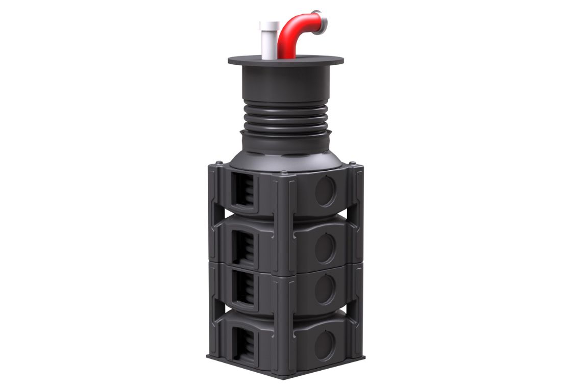 Der QuadroTake Löschwasserentnahmeschacht wird in das Blockraster integriert und ist für verschiedene Anlagengrößen mit passendem Zubehör verfügbar. Der Schacht besteht aus einem Grundschacht mit Pumpensumpf gemäß DIN 14230, einem Schachtaufsetzrohr, einem Saugrohr DN/ID 125 mit Überflursauganschluss ohne Peilstutzen gemäß DIN 14244 sowie einer Belüftereinheit.