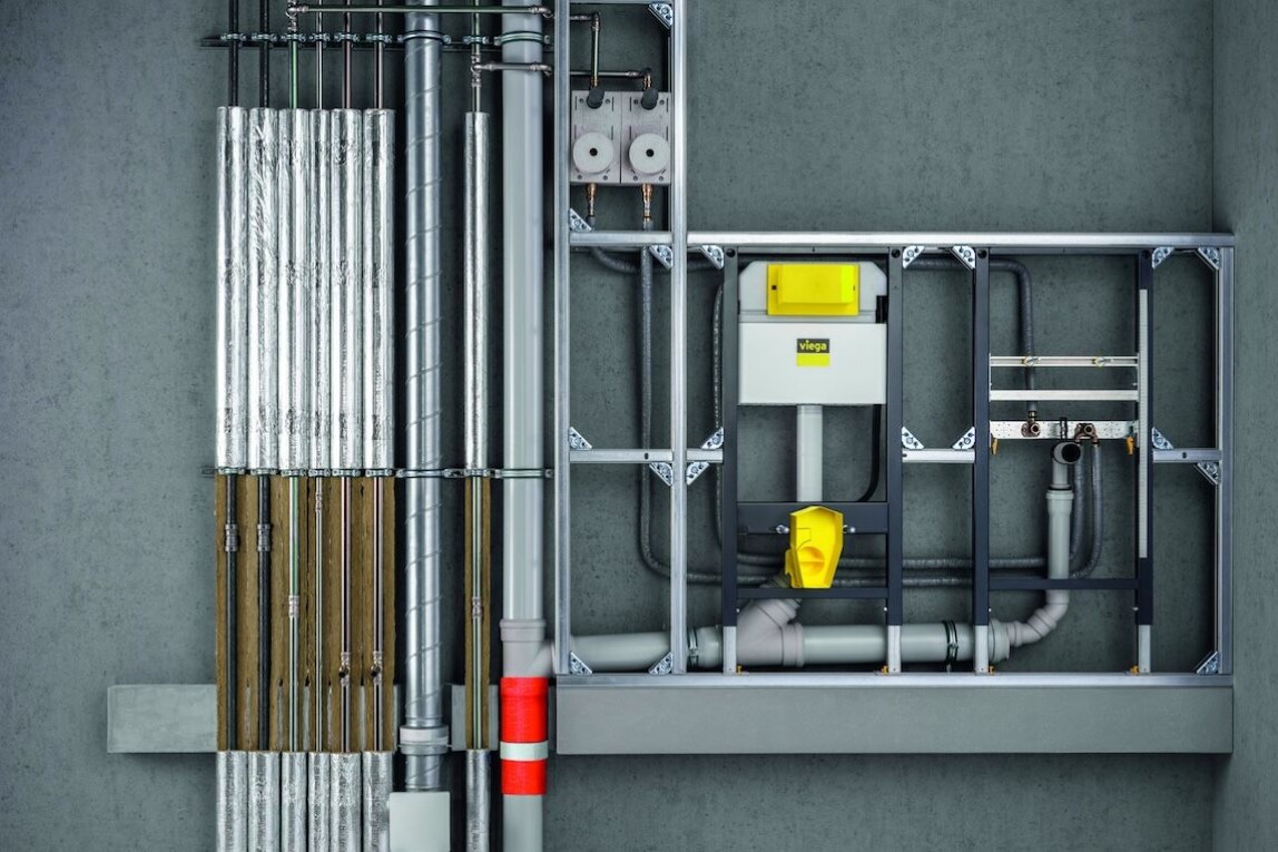 Ein weiterer Anwendungsbereich ergibt sich bei Mischinstallationen: Deckendurchführungen von brennbaren Abwasserrohren dürfen mit dem „Brandschutzband Typ F” im Nullabstand zu metallenen Rohrleitungen von Viega ausgeführt werden, sofern für diese eine allgemeine Bauartgenehmigung (aBG; Z-19.53-2258) vorliegt. Das betrifft beispielsweise Heizungsinstallationen mit Pressverbindersystemen wie Raxofix. Durch den zulässigen Nullabstand kann die erforderliche Schachtbreite um rund zehn Zentimeter reduziert werden.