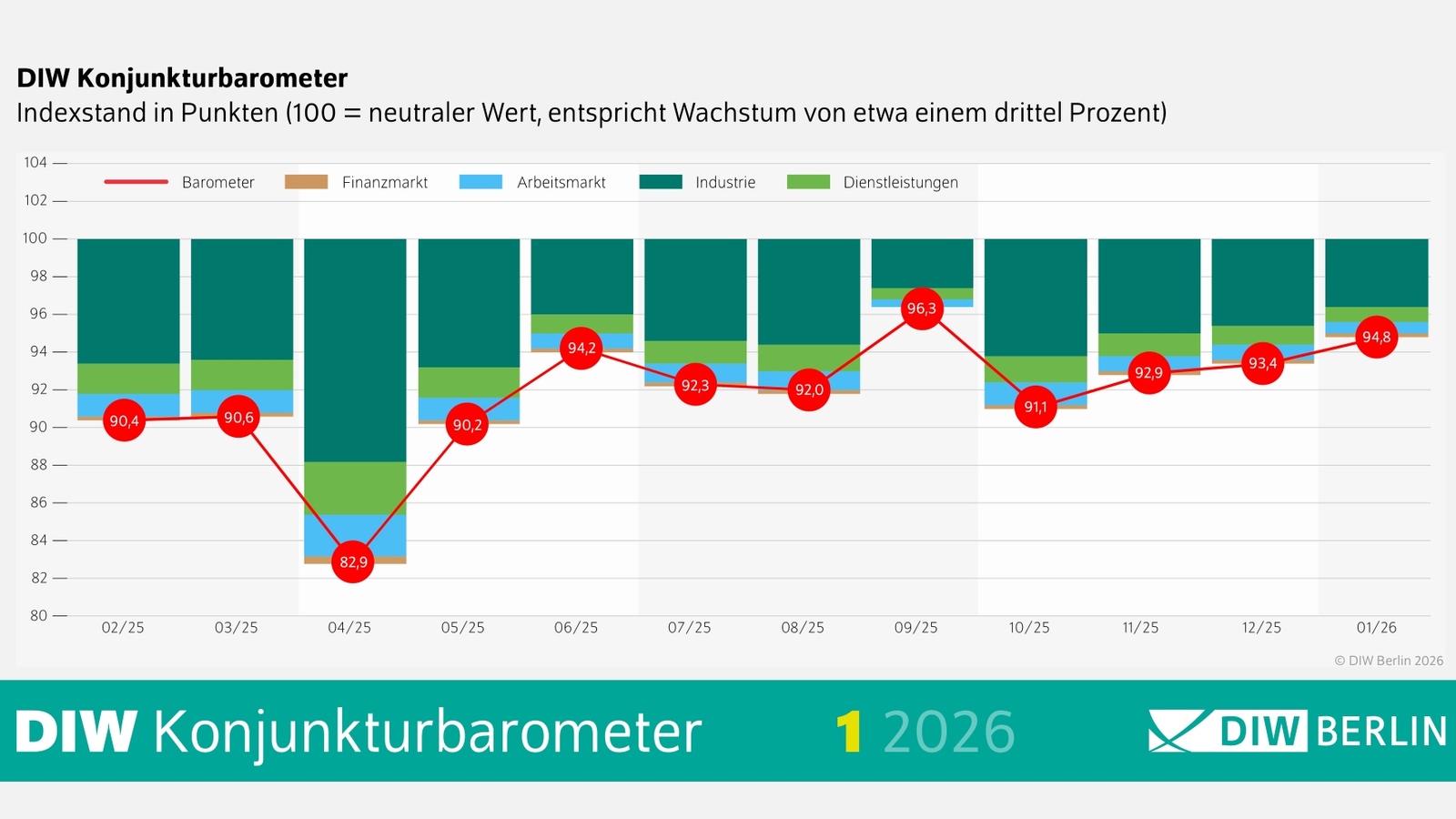 (28.01.2025) Das Konjunkturbarometer des Deutschen Instituts für Wirtschaftsforschung (DIW Berlin) steigt im Januar 2026 auf 94,8 Punkte. Im Dezember lag der Wert noch bei 93,4 Punkten. Somit ist der Barometerwert etwas an die 100-Punkte-Marke gerückt, die ein durchschnittliches Wirtschaftswachstum anzeigt.