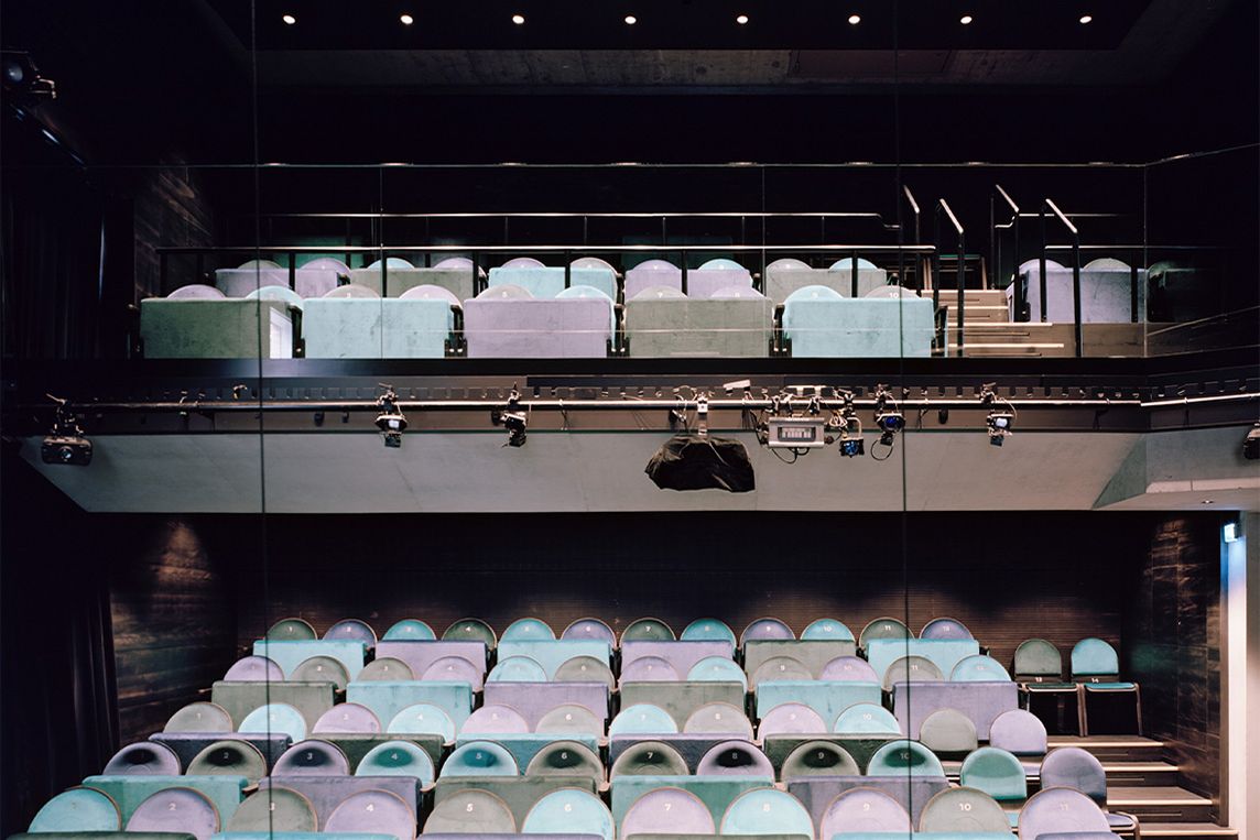 Im Theatersaal im Obergeschoss sorgt ein zurückhaltendes Lichtkonzept für eine ausgewogene, warme Raumstimmung. Ein speziell entwickelter Kronleuchter aus zarten, gefalteten Streckmetallgittern erinnert an „Tänzer” oder Marionetten: Das Material verleiht den Figuren Leichtigkeit und erzeugt reizvolle Lichtreflexe.