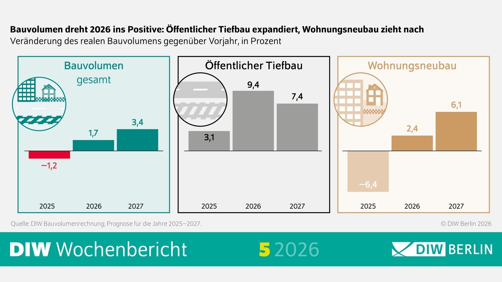 Weitere Angaben sind unter dem Titel „Bauwirtschaft kehrt zurück auf Wachstumskurs” im aktuellen DIW-Wochenbericht 5 2026 auf den Seiten 55 - 67 zu finden.