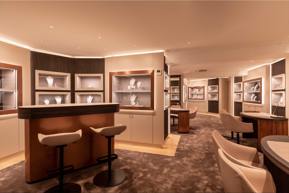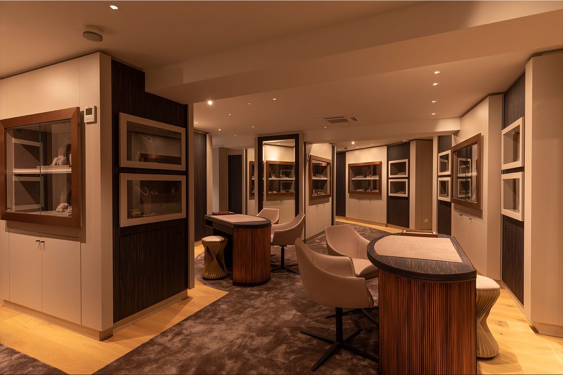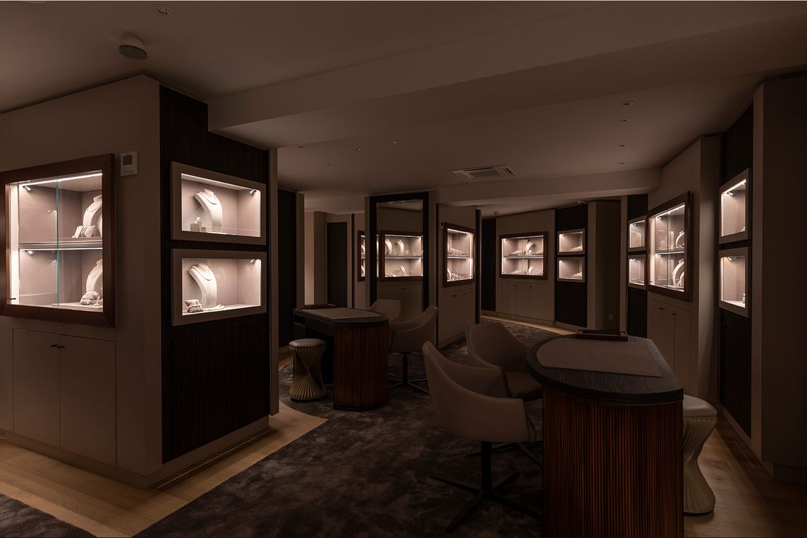 Das Gebäude weist niedrige Decken, schmale Räume und eine komplexe Grundstruktur auf. Für die Präsentation von Schmuck und Uhren wurde eine Beleuchtung benötigt, die sich flexibel an unterschiedliche Nutzungssituationen anpassen lässt und gleichzeitig sicherheitsrelevante Funktionen unterstützt.