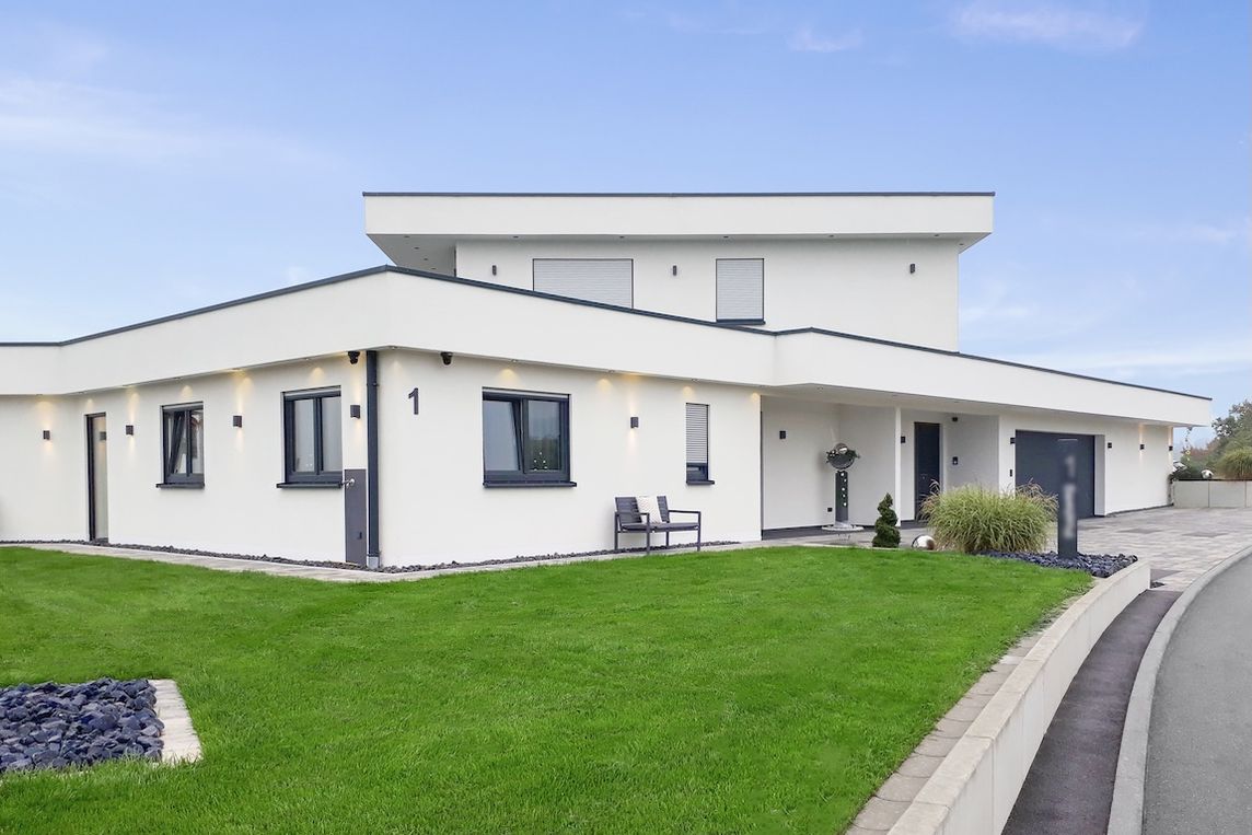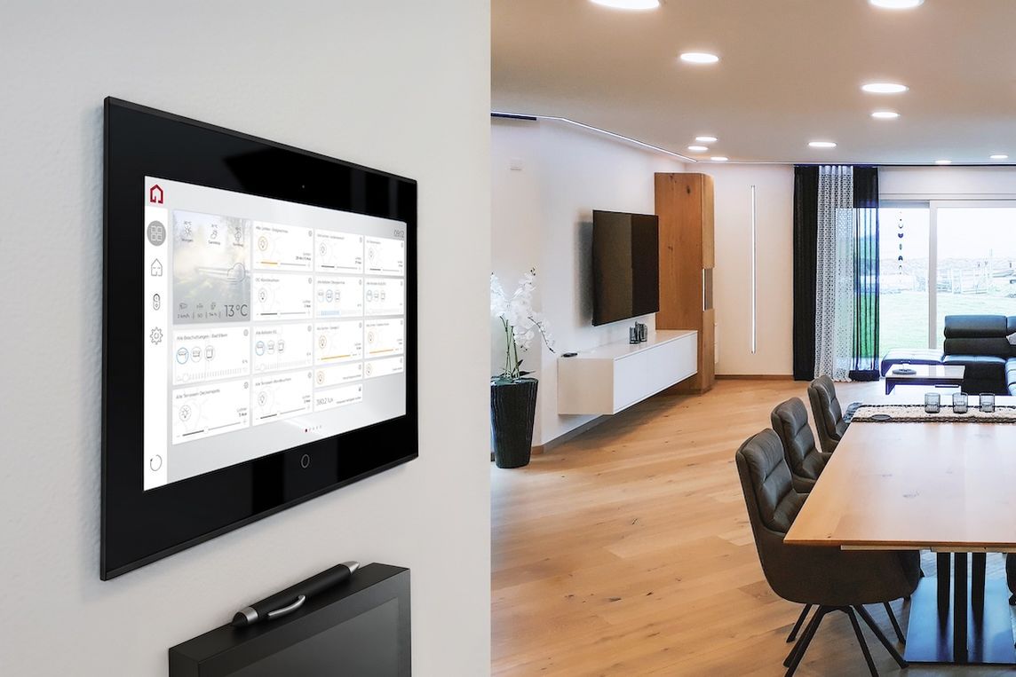 Das Gebäude umfasst ein ebenerdiges Wohnhaus mit 200 m² Wohnfläche, einen Outdoor-Küchenbereich sowie eine 75m²-Einliegerwohnung. Das Touchpanel ist zentral an einer Trennwand zwischen Küche und Flur installiert. Ergänzend sind in allen Räumen Gira 4-Tastsensoren verbaut, die Hauptbeleuchtung und Beschattung bedienen.
