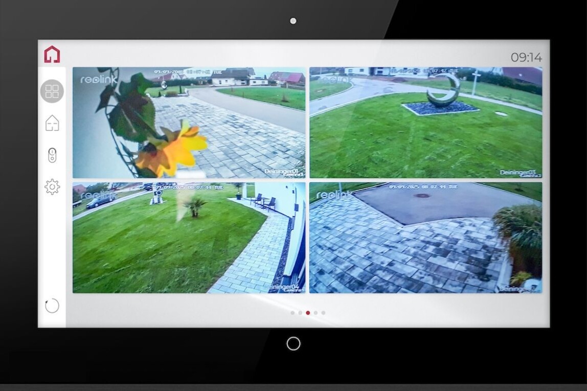 Sieben Außenkameras überwachen das Grundstück und werden über das Youvi-Kamera-Modul dargestellt. Die Türkommunikation erfolgt über eine Gira-Audio-Sprechstelle, ergänzt durch eine Reolink-IP-Kamera für das Videobild. Die Integration erlaubt den Bewohnern eine zentrale Überwachung des Eingangsbereichs.