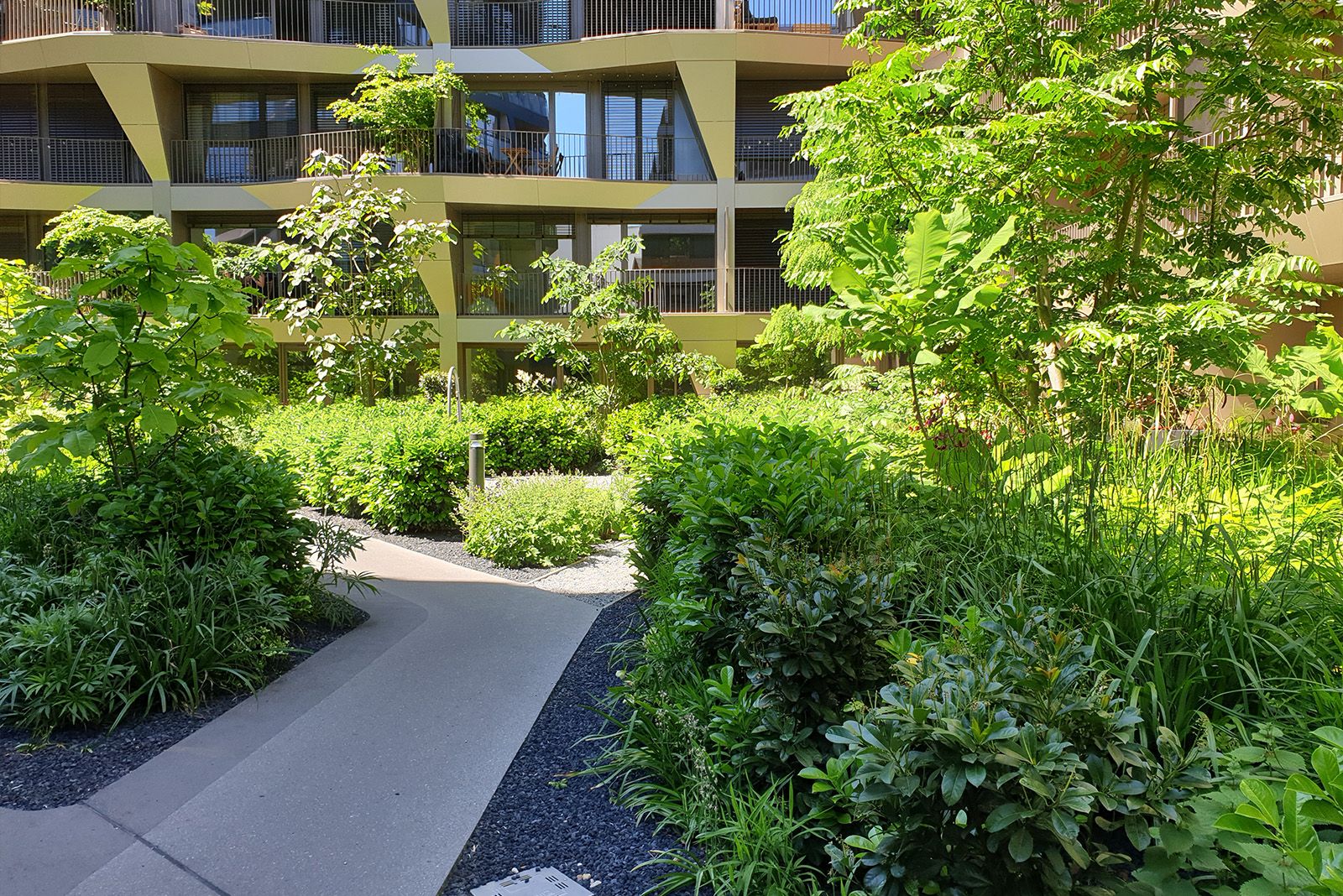 Die 60 mm hohen Retentionsspacer RS 60 schaffen bei Charlie Living einen zusätzlichen Wasserrückhalt von 55 l/m² unterhalb der Intensivbegrünungen, während unter den gewünschten Fahrbelägen zur Bauzeit des Objekts noch Floradrain FD 60 neo mit Splittverfüllung eingesetzt wurde. Die 40 - 80 cm Substratschüttung, bestehend aus dem Untersubstrat Zincolit Plus und der Zinco-Systemerde Lavendelheide als Obersubstrat, speichert Wasser in einer Größenordnung von 120 - 240 l/m².