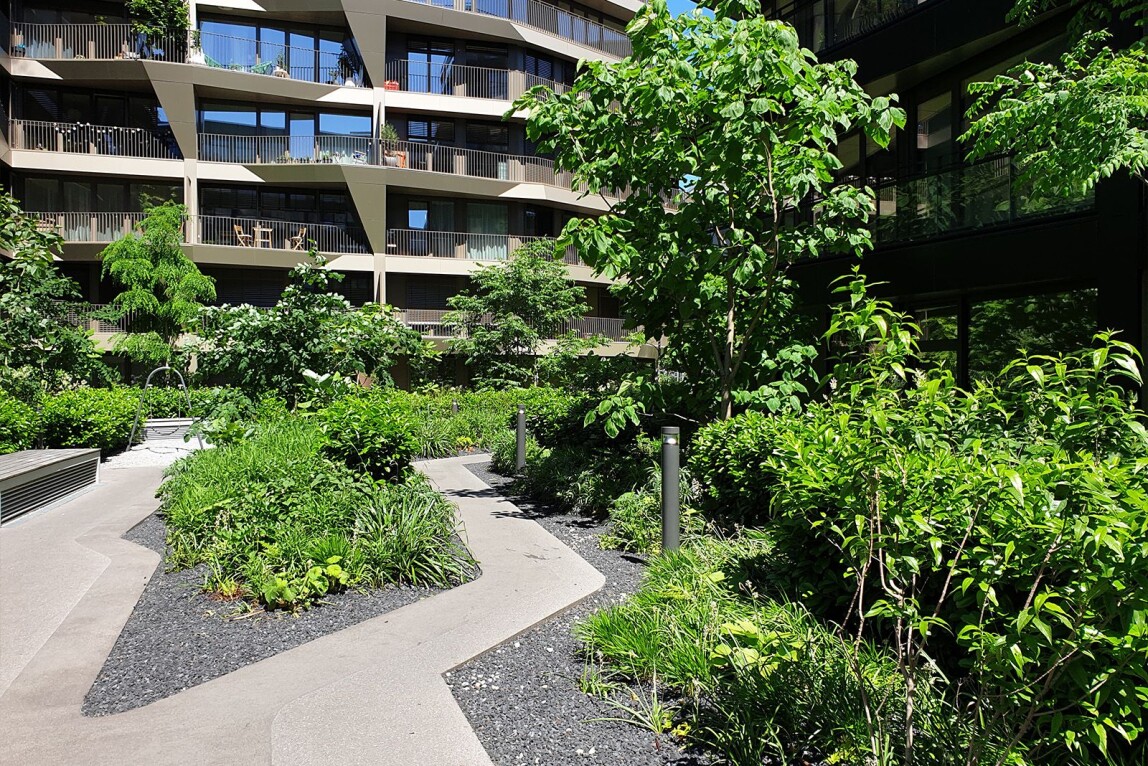(9.2.2026) Als das Wohnquartier Charlie Living in Berlin 2017 in seine dreijährige Bauphase startete, steckten die Ideen zur Nutzung von Dachflächen als Retentionsfläche vielerorts noch in den Kinderschuhen. Zinco und die Stadt Berlin sahen jedoch das Potenzial, wodurch Charlie Living eines der ersten Retentions-Objekte, mit 4.000 m² begrüntem Dschungel zwischen Geh-, Fahr- und Spielbereichen auf der Tiefgaragendecke, wurde. Der Zinco-Systemaufbau mit den Retentionsspacern RS 60 schaffte einen zusätzlichen Wasserrückhalt von 55 l/m² – unabhängig von jeglicher Gestaltung der Freiflächen.