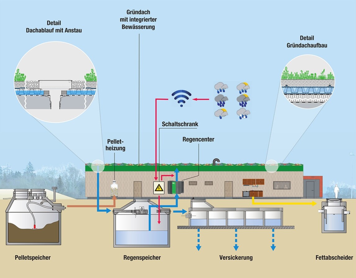 Das Retentions-Gründach, die Zisterne und die Rigole sind über eine Hauswasserstation miteinander vernetzt. Das System ermöglicht die Speicherung, Nutzung, Verdunstung und Versickerung von Regenwasser. Dadurch wird ein nachhaltiger Umgang mit der Ressource Wasser erreicht und eine Wasserbilanz ermöglicht, die dem natürlichen Zustand vor der Bebauung entspricht.