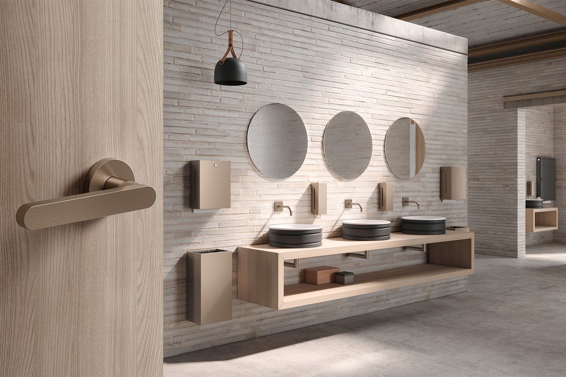 Auch die Beschläge sind Bestandteil der abgestimmten Produktlinien. Sie sind in Materialität und Formensprache auf die Sanitärprodukte abgestimmt und ermöglichen ein konsistentes Gesamtbild. Die Systeme sind in unterschiedlichen Ausführungen erhältlich und technisch aufeinander abgestimmt.