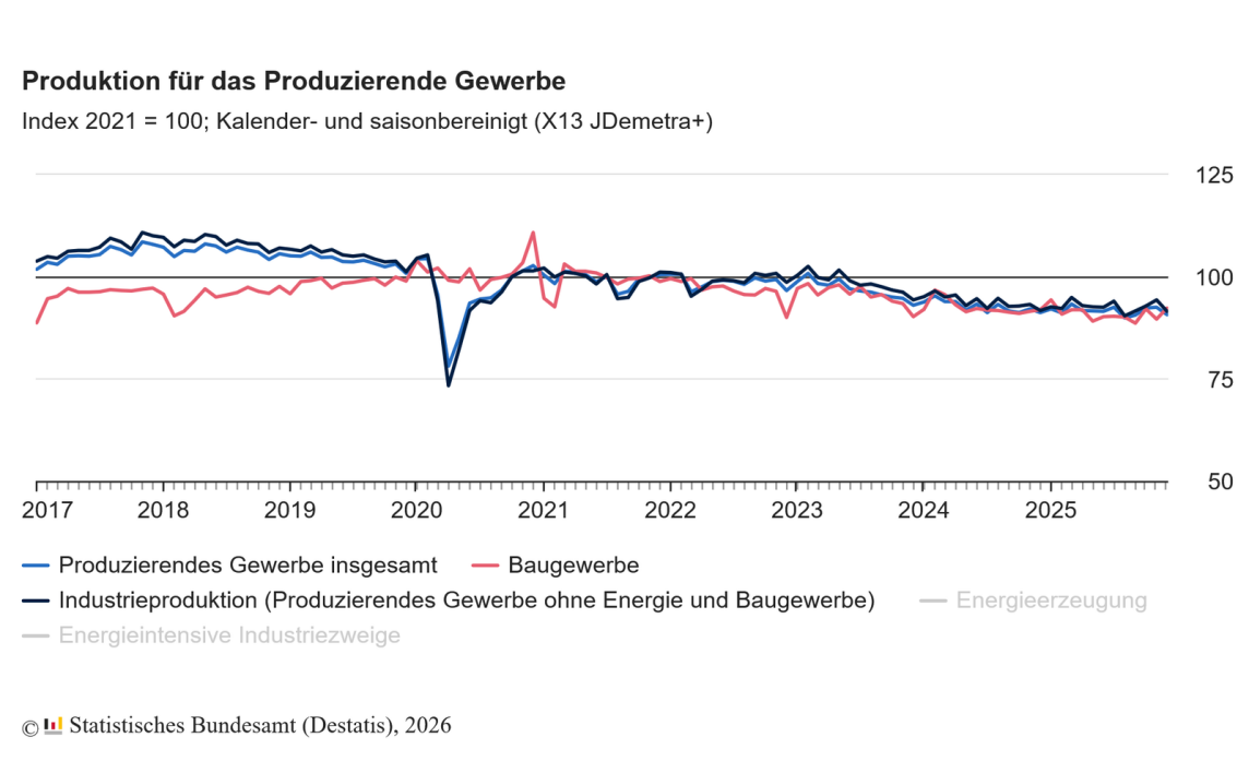 Die Industrieproduktion (Produzierendes Gewerbe ohne Energie und Baugewerbe) sank im Dezember 2025 gegenüber November 2025 saison- und kalenderbereinigt um 3,0 %. Dabei sank die Produktion von Investitionsgütern um 5,3 % und von Vorleistungsgütern um 1,2 %. Außerhalb der Industrie sank die Energieerzeugung um 1,8 %.