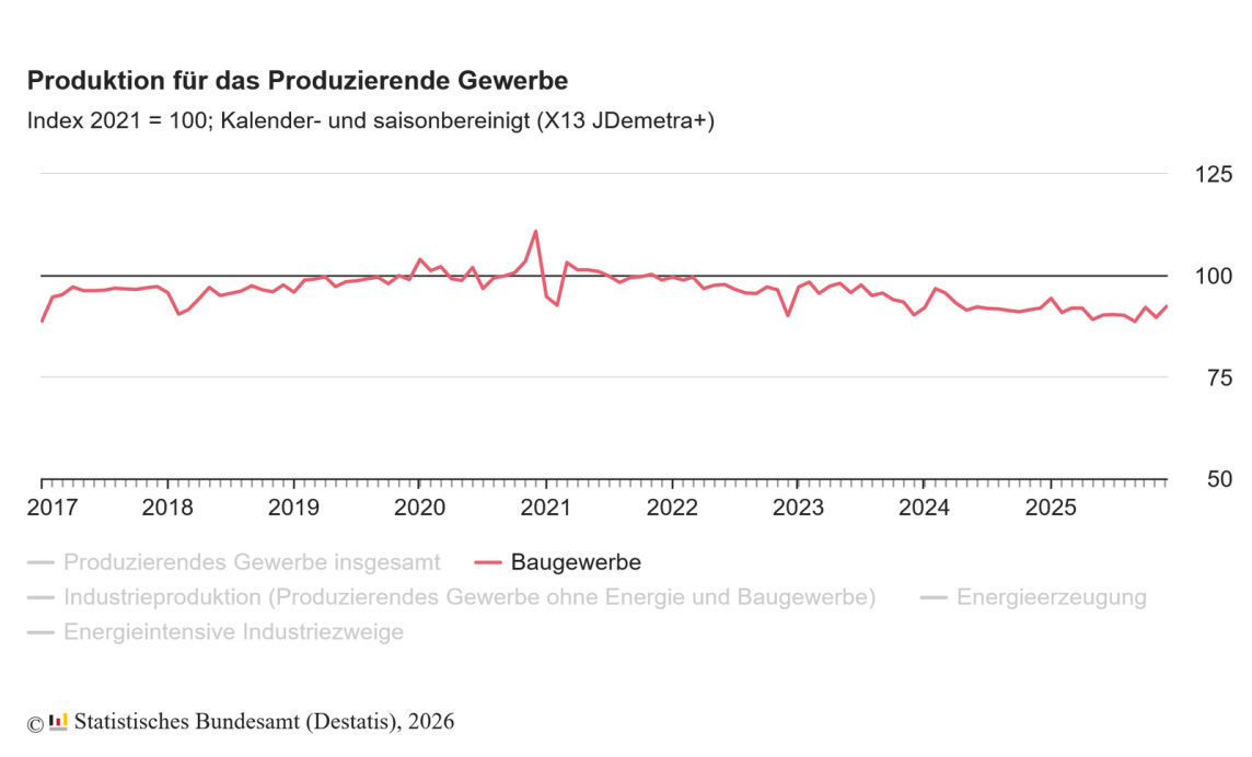 (6.2.2026) In Gesamtjahr 2025 sank die Produktion im Produzierenden Gewerbe kalenderbereinigt um 1,1 % gegenüber 2024. Dabei war die Produktion im Baugewerbe -1,7 % niedriger als im Vorjahr.