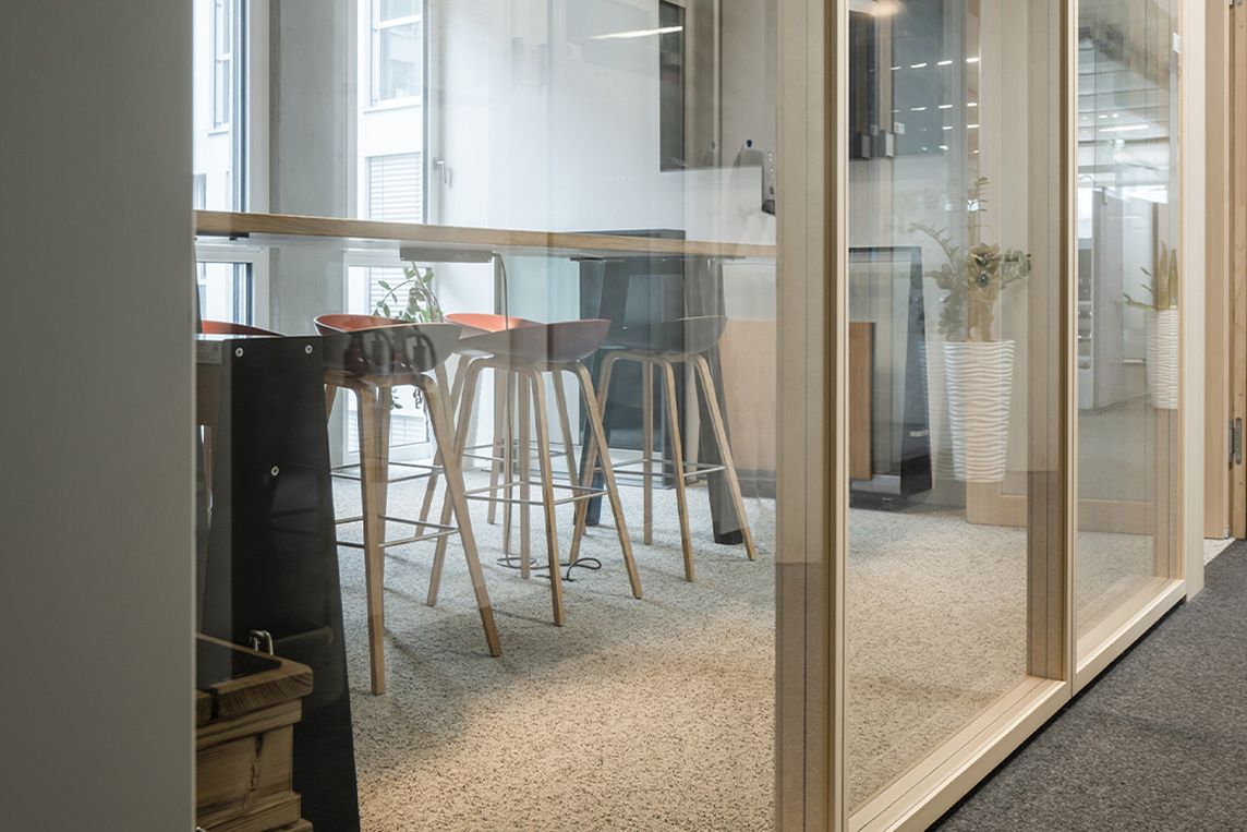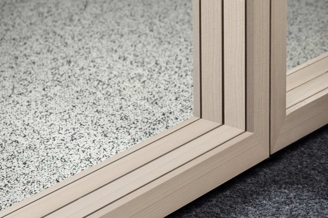 (10.2.2026) Die Glastrennwand Lindner Life Stereo_N verfügt über einen umlaufenden, seitlich eingehängten Holzrahmen. Verschiedene lackierte Holzarten erlauben die Einbindung in unterschiedliche Raumkonzepte.