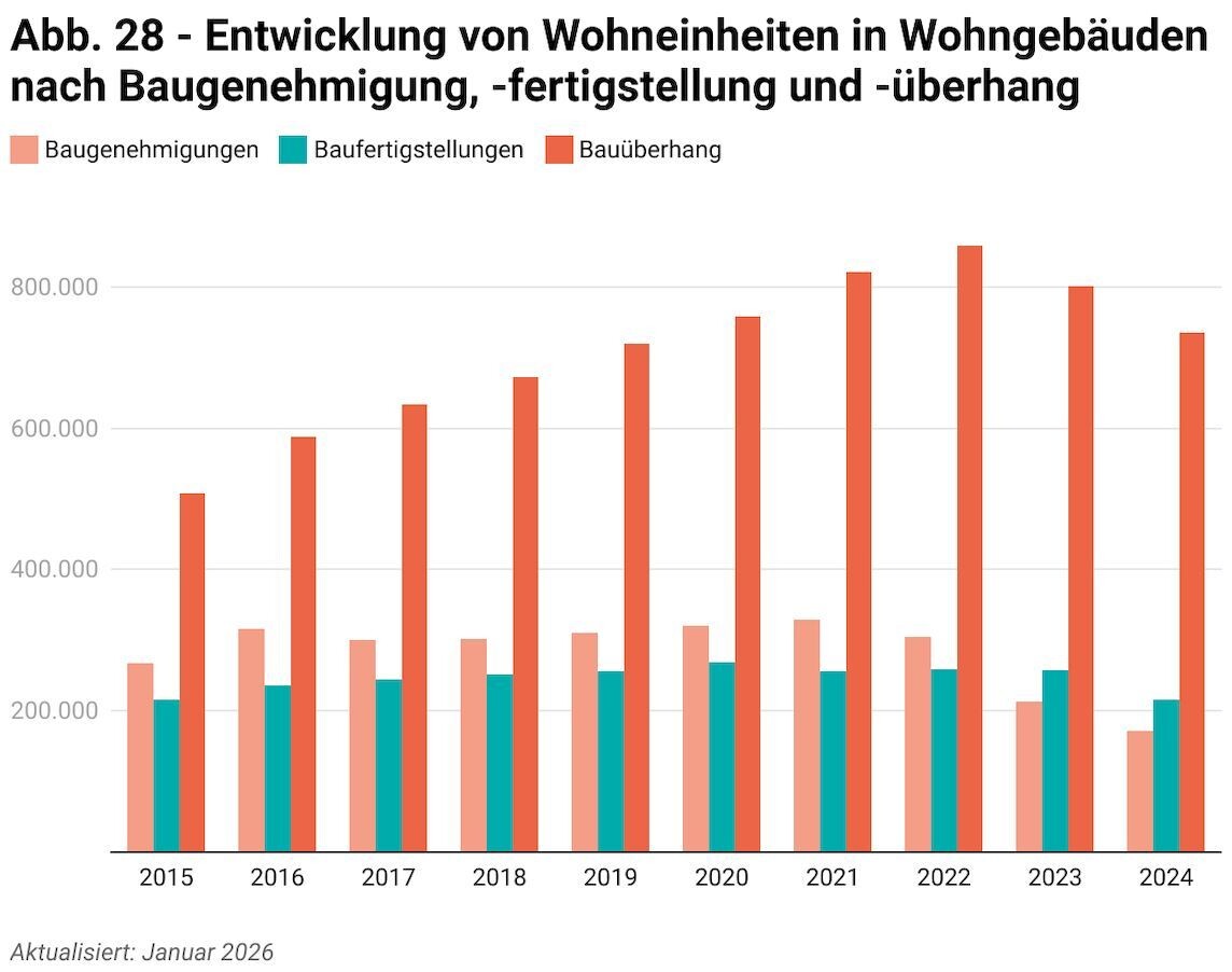 Der Gebäudesektor sichert rund 3,7 Mio. Arbeitsplätze in Handwerk, Industrie und Handel und ist damit ein zentraler Beschäftigungsfaktor in Deutschland. Gleichzeitig ging die Neubautätigkeit 2024 deutlich zurück. Beim Bauüberhang – genehmigte, aber noch nicht fertiggestellte Wohnungen – zeigt sich jedoch eine erste Entspannung: Nach dem Höchststand von rund 858.000 Einheiten im Jahr 2022 sank die Zahl 2024 auf etwa 738.000.