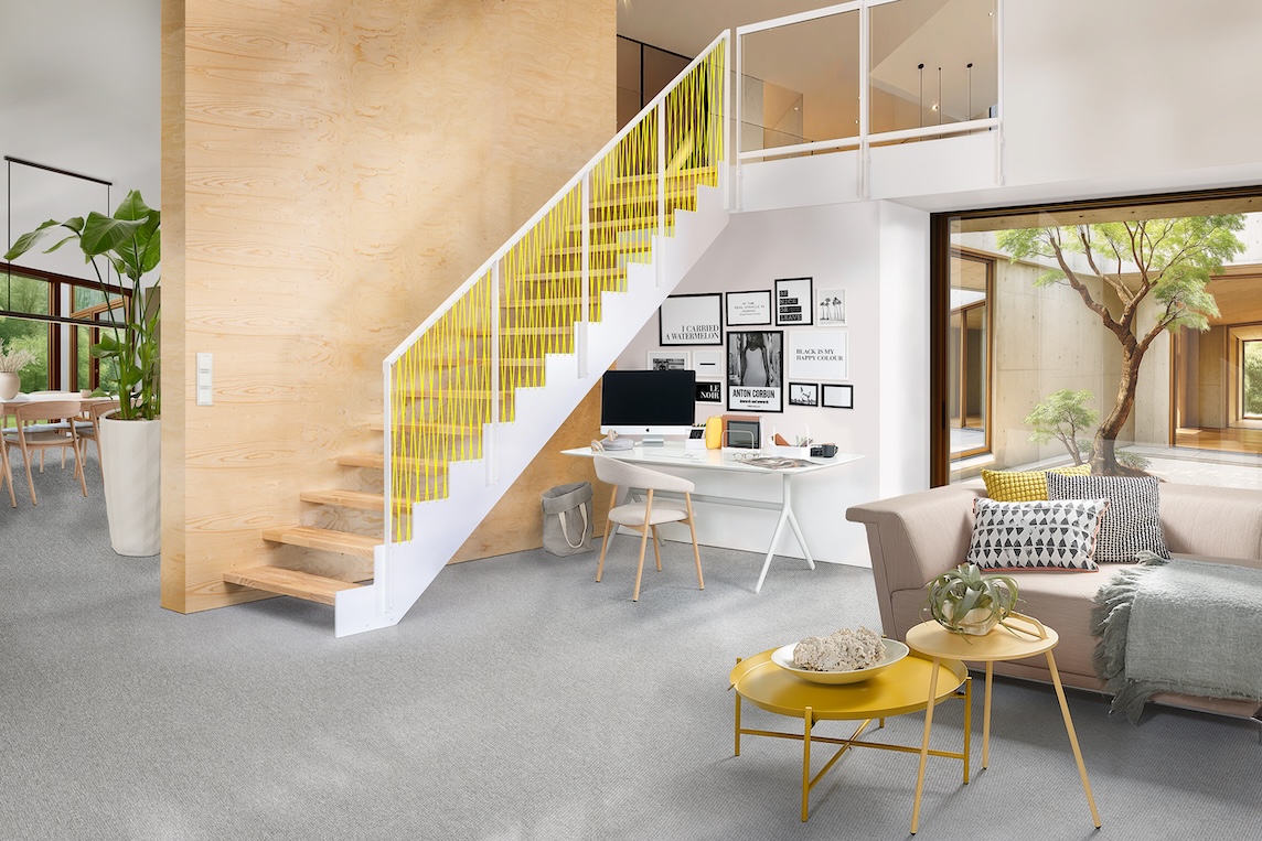 Die Wangentreppe „Cordis” ist mit einem Flachstahlgeländer im T-Profil sowie einer 13 mm starken Loftwange ausgeführt. Die Konstruktion ist minimalistisch und offen gehalten. Sie eignet sich für Wohnkonzepte wie skandinavische Interieurs oder Loftwohnungen. Beim Jubiläumsmodell stehen weiße Oberflächen im Kontrast zu den leuchtend gelben Schnüren des Geländers.