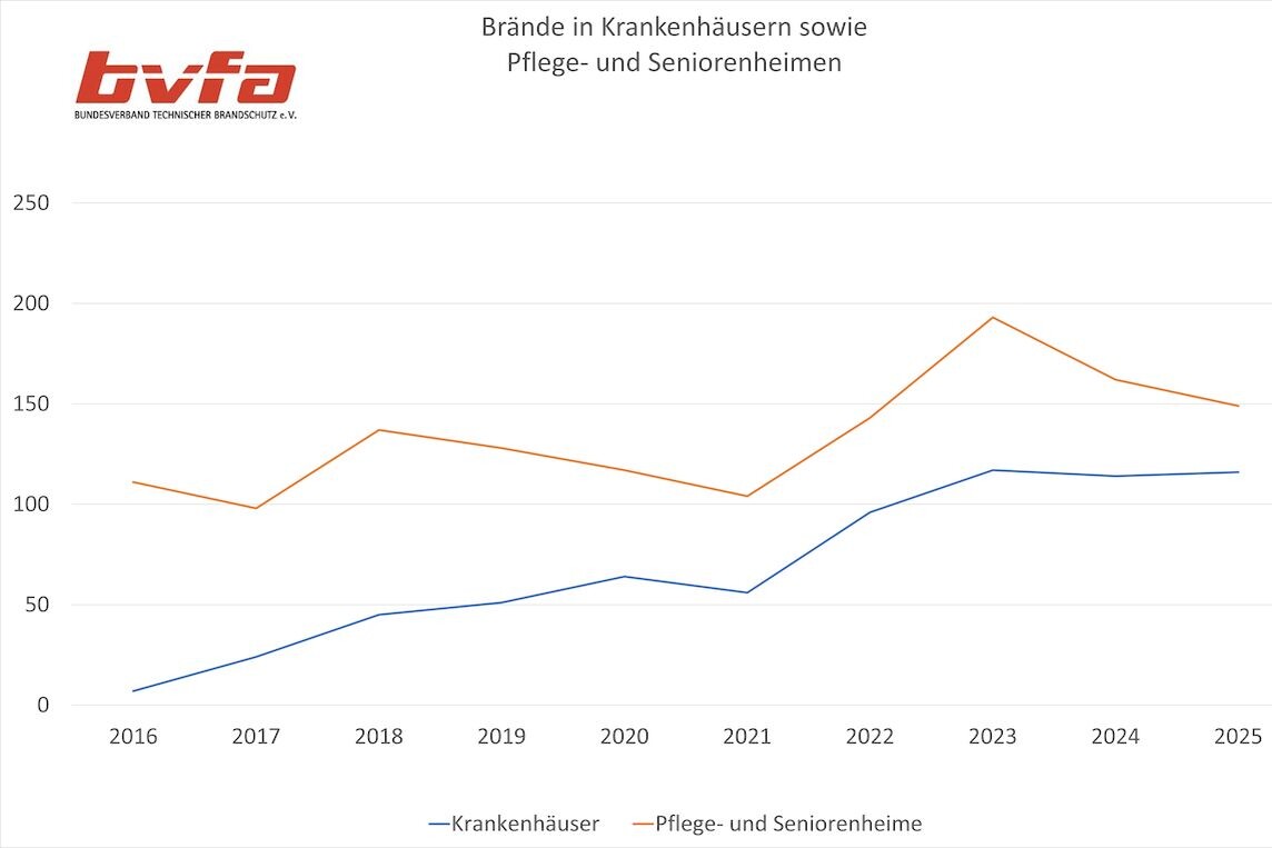 (13.2.2026) Die aktuelle Brandstatistik 2025 des bvfa – Bundesverband Technischer Brandschutz e.V. zeigt: Trotz rückläufiger Opferzahlen bleibt das Brandrisiko in Krankenhäusern sowie Pflege- und Senioreneinrichtungen in Deutschland auf einem kritischen Niveau. Nach Angaben des Verbandes ist der unzureichende Einsatz automatischer Löschanlagen weiterhin ein zentraler Risikofaktor.