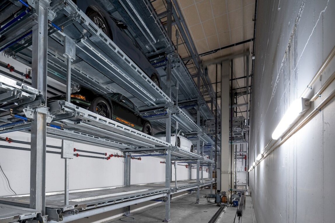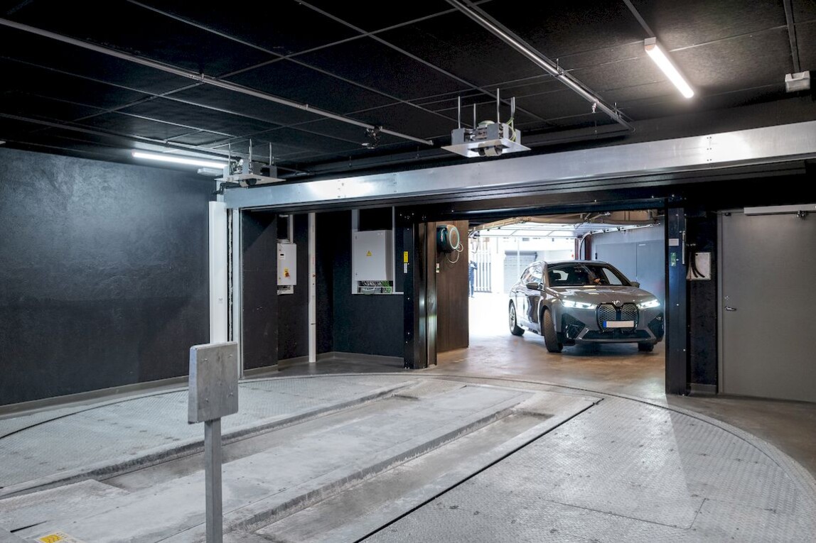 Das Parksystem ist vollständig automatisiert und nutzt den vorhandenen Raum effizient. Der Übergabebereich befindet sich innerhalb des Gebäudes. Eine integrierte Drehvorrichtung ermöglicht das Ein- und Ausfahren in Fahrtrichtung. Die Steuerung erfolgt über ein RFID-System. Alle Stellplätze sind mit Lademöglichkeiten für Elektrofahrzeuge ausgestattet.