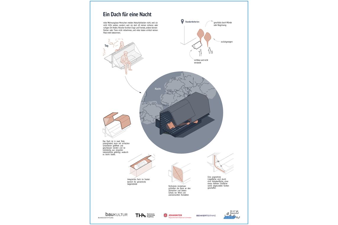 „Ein Dach für eine Nacht” ist ein multifunktionales Stadtmöbel, das tagsüber als Sitzgelegenheit dient und nachts in einen geschützten Rückzugsort umgewandelt werden kann. Das niedrigschwellige Angebot richtet sich an Menschen, für die konventionelle Notunterkünfte keine praktikable Option darstellen. Damit nimmt das Projekt eine bewusste Gegenposition zu ausgrenzender Architektur ein.
