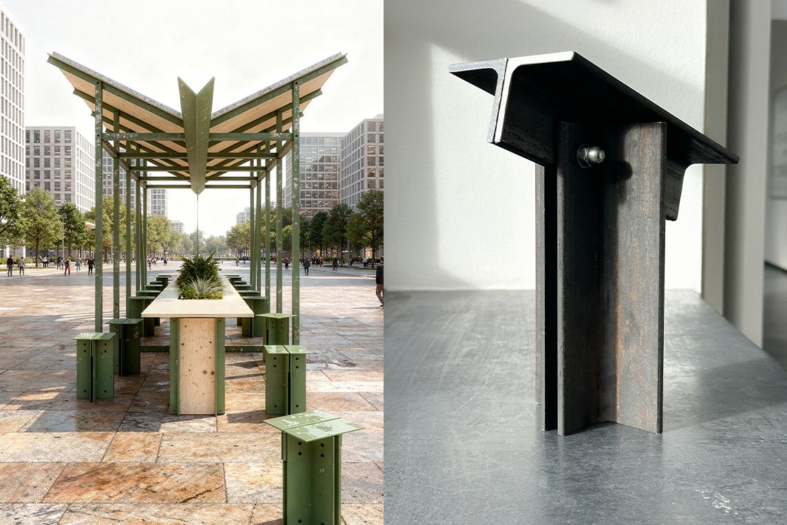 Activate: Stützen und Deckenelemente werden zu einer neuen Stahlstruktur verbunden, die den öffentlichen Raum aktiviert.