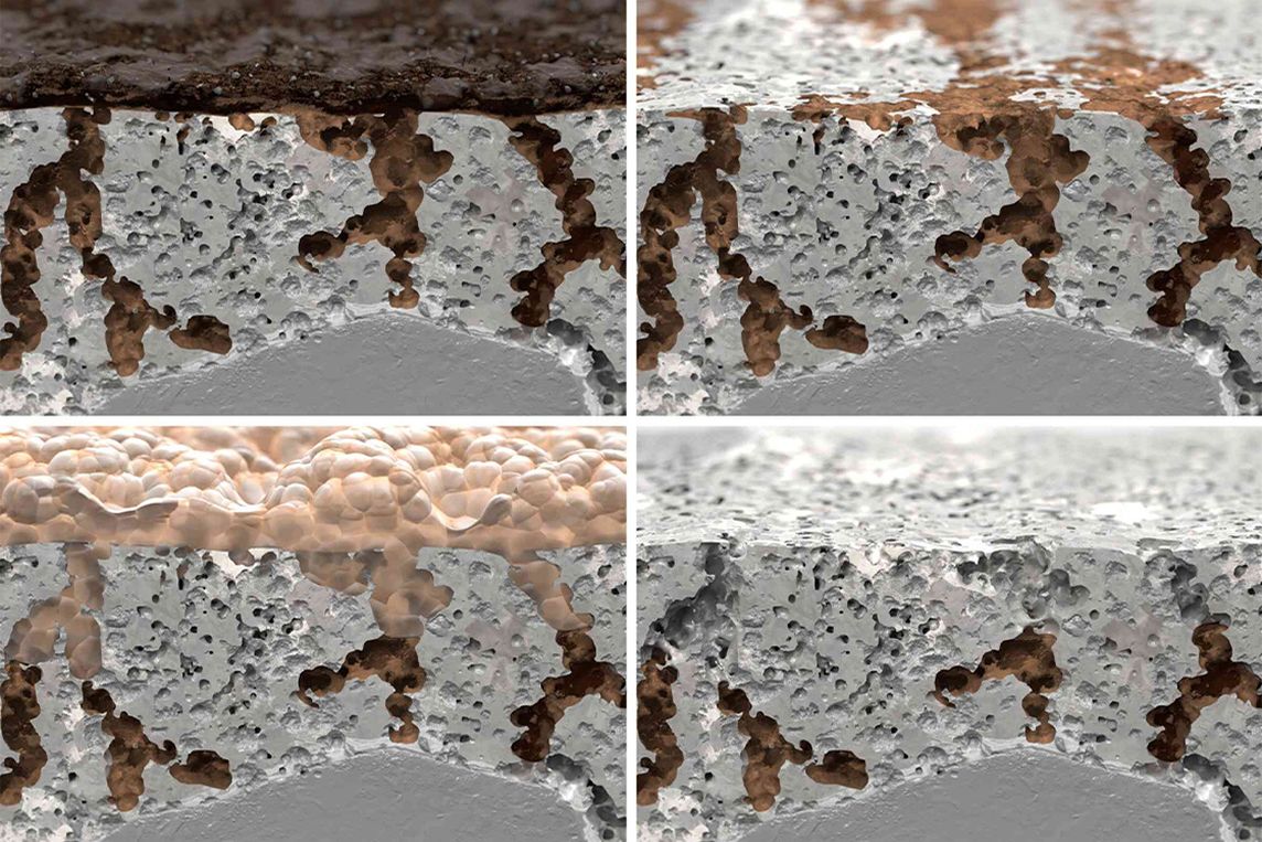 Beim Rückbau zeigen sich häufig Schäden im Betonuntergrund; Fehlstellen werden mit Reparaturmörtel instandgesetzt. Gleichzeitig ist eine tiefenwirksame Reinigung notwendig, um kapillar aufsteigendes Öl aus dem Untergrund zu entfernen und so die Haftung der neuen Beschichtung sicherzustellen. Bewährt hat sich der HVP O Ölentferner (Schencking & Bury), abgestimmt auf die Grundierung StoPox HVP O (StoCretec). Der Ölentferner wird aufgetragen und mit Wasser in den Boden eingerieben. Kapillarwirkung und Wasser transportieren daraufhin gekapselte Mikroölpartikel an die Oberfläche, wo das entstandene Öl-Schaum-Gemisch mit einem Nasssauger aufgenommen werden kann.
