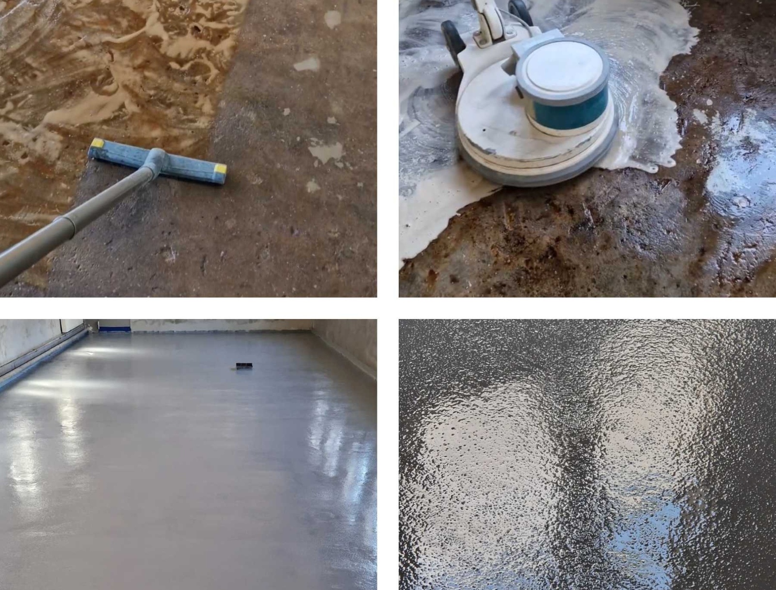 Links unten: Grundierung StoPox HVP O wirkt als Barriere gegen kapillar aufsteigendes Öl. Rechts unten: Ergebnis - neuer Hallenboden — grundiert, gespachtelt, versiegelt und abgesandet. (Bilder: StoCretec GmbH)