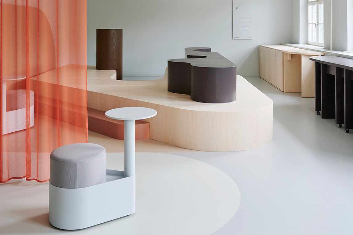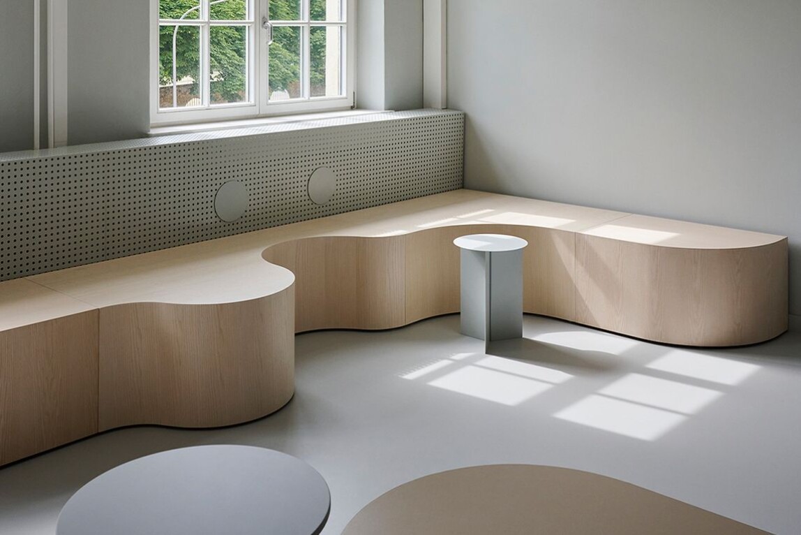 Als durchgängiges Material wurde auf der gesamten Pilotfläche der Kautschukbelag Noraplan uni verlegt. Entscheidend für diese Wahl waren sowohl die baulichen Rahmenbedingungen als auch gestalterische Überlegungen: Wegen des Denkmalschutzes des Kasernengebäudes durfte der bestehende Boden nicht entfernt werden – Noraplan uni lässt sich direkt auf dem Altbelag verlegen. Darüber hinaus überzeugt das Material durch Zurückhaltung in Optik, hohe Strapazierfähigkeit und leichte Reinigungsmöglichkeiten, wodurch Möblierung, Zonierung und das modulare Mäandersystem klar zur Geltung kommen.