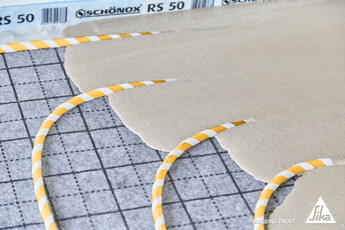 Die Hybrid-Spachtelmasse Schönox HS 50 wird nach der Verlegung der Heizrohre, abhängig vom jeweiligen System, in unterschiedlichen Schichtstärken eingebracht.