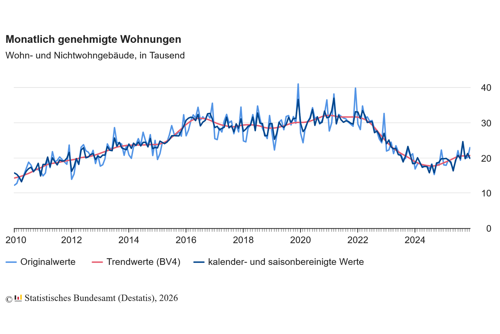 Die Zahl der genehmigten Wohnungen im Neubau stieg im Jahr 2025 um 12,6% oder 22.100 auf 198.100 Wohnungen. Die Zahl genehmigter Wohnungen im Bestand, stieg um 2,7% oder 1.000 auf 40.400 Wohnungen.