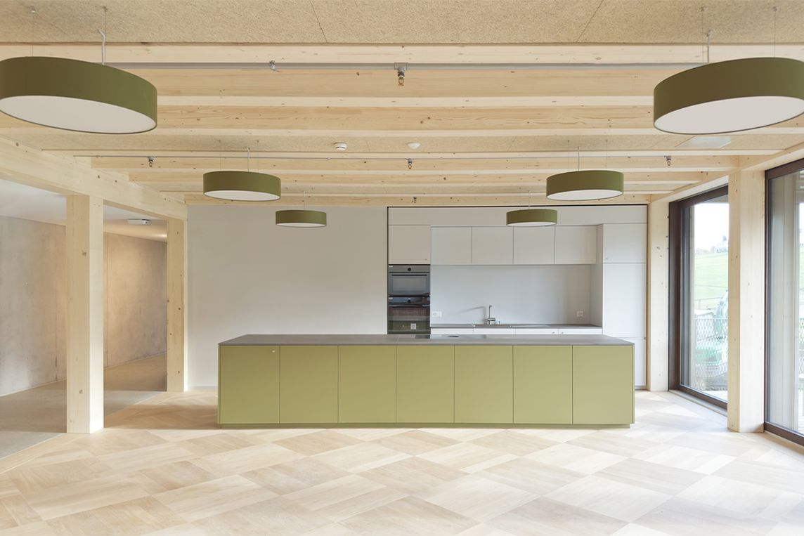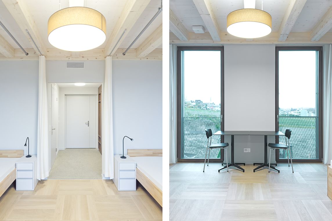 Der Holzbau prägt die Gestalt des Gebäudes beeinflusst durch die sichtbare Tragstruktur weiterhin die Atmosphäre im Inneren. Holz sorgt für ein ausgewogenes Raumklima und vereint Behaglichkeit, gute Luftqualität und akustische Ruhe. „Die Materialisierung erzeugt eine wohnliche Atmosphäre und distanziert das Projekt bewusst von der typischen Erscheinung von Spitalbauten”, erläutern Scheitlin Syfrig Architekten den Ansatz.