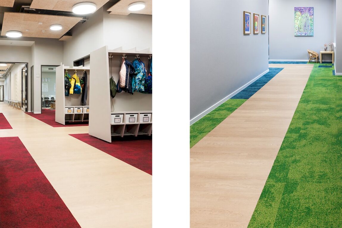„Ziel der Neugestaltung war es, eine freundliche, klare und pädagogisch hochwertige Atmosphäre zu schaffen, in der sich alle Nutzerinnen und Nutzer gleichermaßen wohlfühlen”, erklärt der verantwortliche Architekt Linus Bocklage von B+B Architekten. „Das Konzept kombiniert ruhige Grundtöne, präzise gesetzte Farbimpulse sowie modulare textile und elastische Bodenbeläge, um ein visuelles Leitsystem zu kreieren, akustische Belastungen zu reduzieren und robuste, pflegeleichte Flächen zu schaffen.”