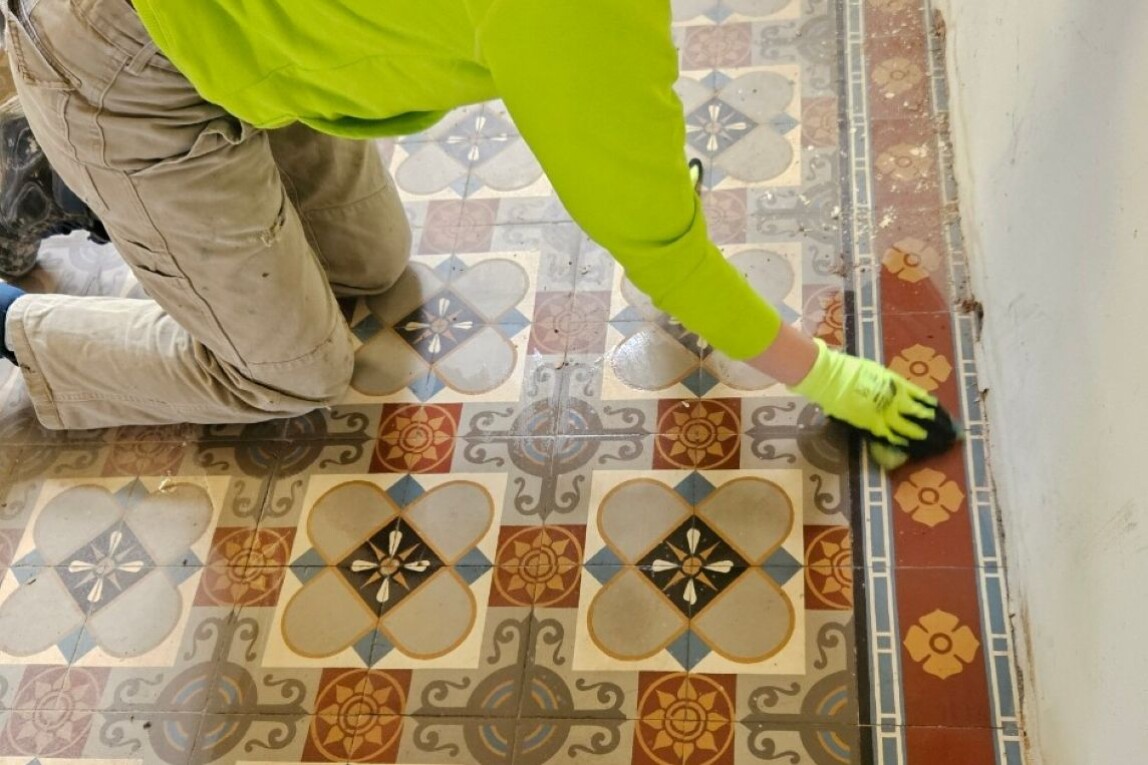 (24.2.2026) Unter der Anleitung des Kunsthistorikers und Restaurators Dr. Ulrich Eltgen untersuchten Freiwillige des Fluthilfecamps der Jugendbauhütten der Deutschen Stiftung Denkmalschutz (DSD) das ehemalige Hotel Bellevue in Remagen. Bei der Voruntersuchung des Bauwerks wurde vor allem die Baugeschichte des Hotels begutachtet. Dabei stießen sie auf historische Bodenfliesen, die sie auf einen traditionsreichen Wirtschaftszweig der Region aufmerksam machten.
