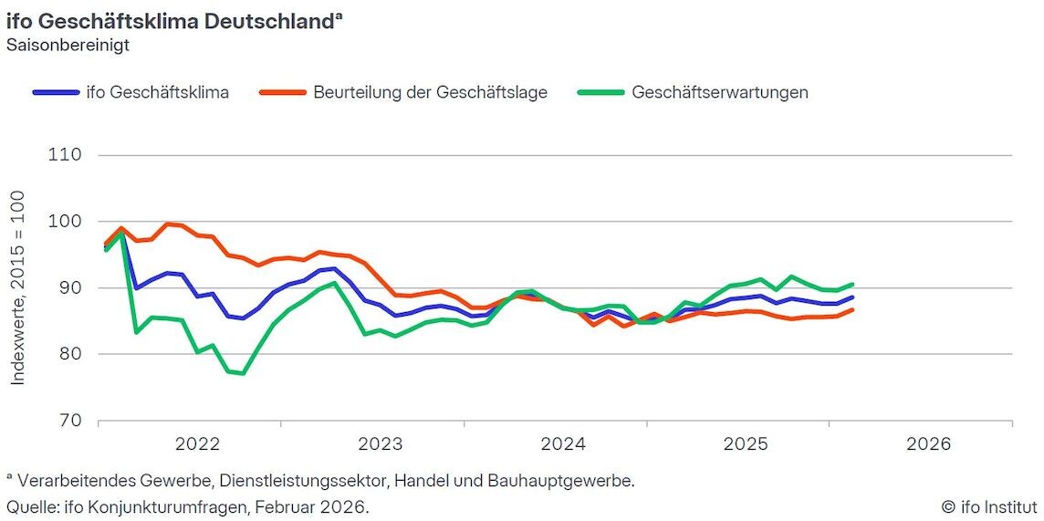 (23.02.2025) Der ifo Geschäftsklimaindex stieg im Februar 2026 auf 88,6 Punkte, nach 87,6 Punkten im Januar. Die Unternehmen zeigten sich zufriedener mit ihren laufenden Geschäften.