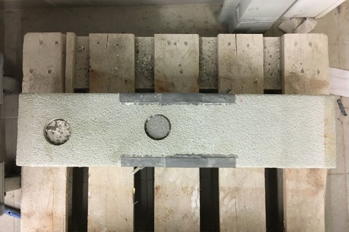 Nach der Applikation der Systemaufbauten, bestehend aus Triflex Pox Primer 116+ als Sperr- und Haftgrundierung, der vliesarmierten Abdichtungsebene Triflex ProPark sowie den Aufbauvarianten 1 bis 3, wurde in den Prüfkörpern ein definierter mittiger Biegeriss erzeugt.