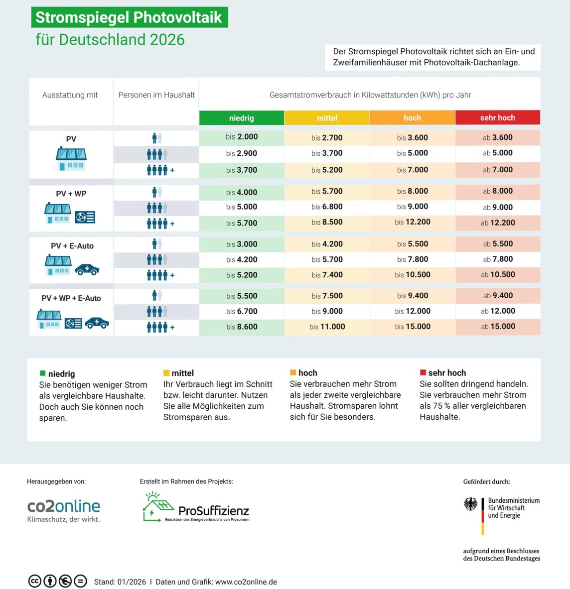 Der Stromspiegel Photovoltaik richtet sich an Hauseigentümer, die ihren Stromverbrauch besser verstehen und optimieren möchten. Wer weiß, ob der eigene Verbrauch gering, mittel oder hoch ist, kann gezielt nach Stromfressern suchen oder den Eigenverbrauch effizienter gestalten.