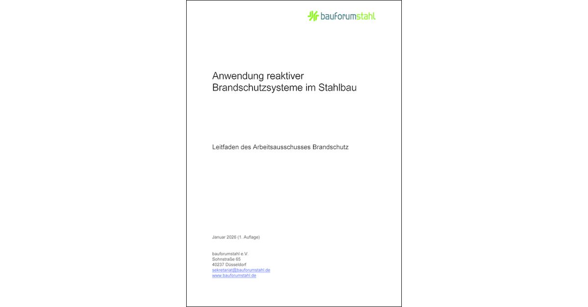 Der Arbeitsausschuss Brandschutz des Deutscher Stahlbau-Verband (DSTV) hat daher Ende 2024 eine Ad-hoc-Gruppe eingesetzt, um den aktuellen Stand der Technik strukturiert zusammenzuführen und praxisgerecht aufzubereiten. Ergebnis ist der Leitfaden „Anwendung reaktiver Brandschutzsysteme im Stahlbau – Leitfaden des Arbeitsausschusses Brandschutz”, der im Januar 2026 in erster Auflage veröffentlicht wurde. Der Leitfaden steht kostenfrei auf der Website von bauforumstahl e.V. oder hier zum PDF-Direktdownload bereit.