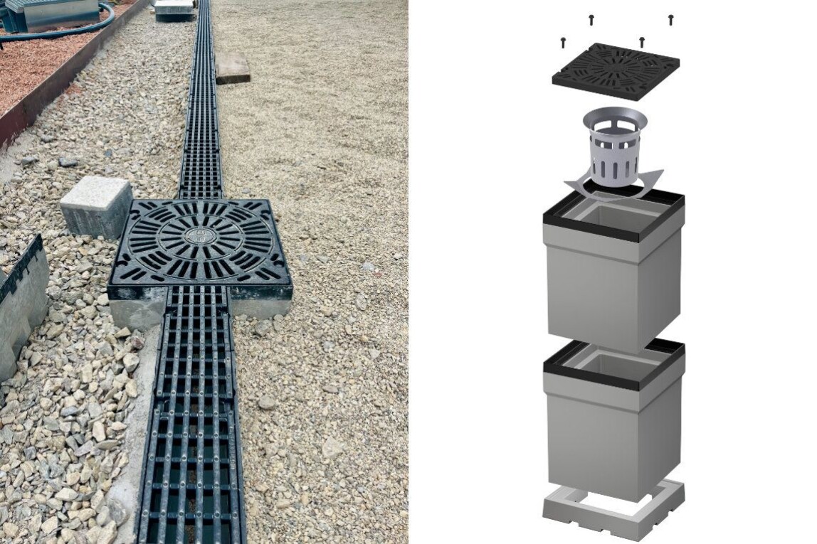 Für die zweite Entwässerungsebene steht optional ein Sockelelement mit seitlichen Drainageöffnungen zur Verfügung. Eine umlaufende Aufkantung stabilisiert den Aufbau. Ergänzend lässt sich ein Aufstockelement einsetzen, um größere Einbauhöhen umzusetzen. Basis- und Aufstockelement können vor Ort gekürzt werden. So sind Schachthöhen von bis zu knapp einem Meter realisierbar, etwa bei hohen Begrünungs- oder Bodenaufbauten.