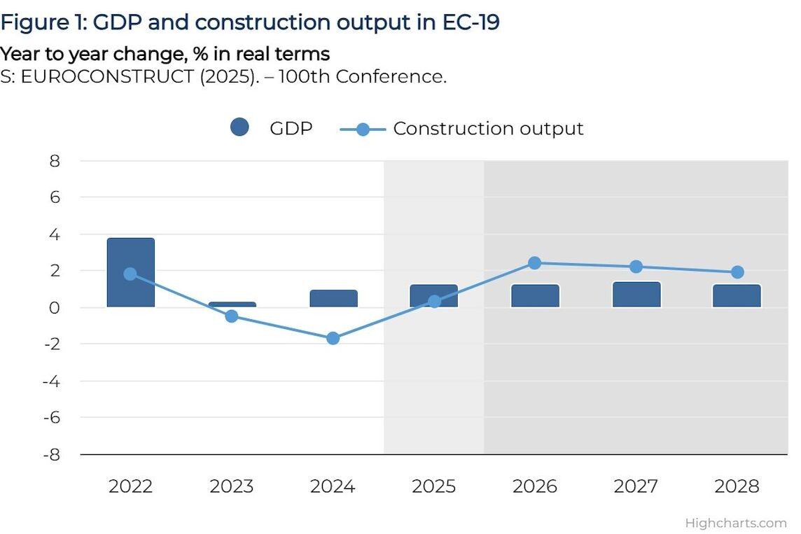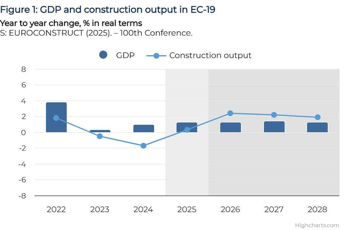 (27.2.2026) Nach zwei Jahren mit rückläufiger Entwicklung stabilisiert sich der europäische Bausektor allmählich. Laut der Prognose der Euroconstruct-Winterkonferenz vom November 2025 sank die Bauproduktion in den 19 Mitgliedsländern 2023 um 0,5 % und 2024 um 1,7 %. Damit verzeichnete die Branche die schwächste Zweijahresphase seit der Pandemie. 2026 soll die Produktion demnach um 2,4 % zulegen. Als Impulse gelten günstigere Finanzierungsbedingungen und eine stärkere Dynamik im Tiefbau.