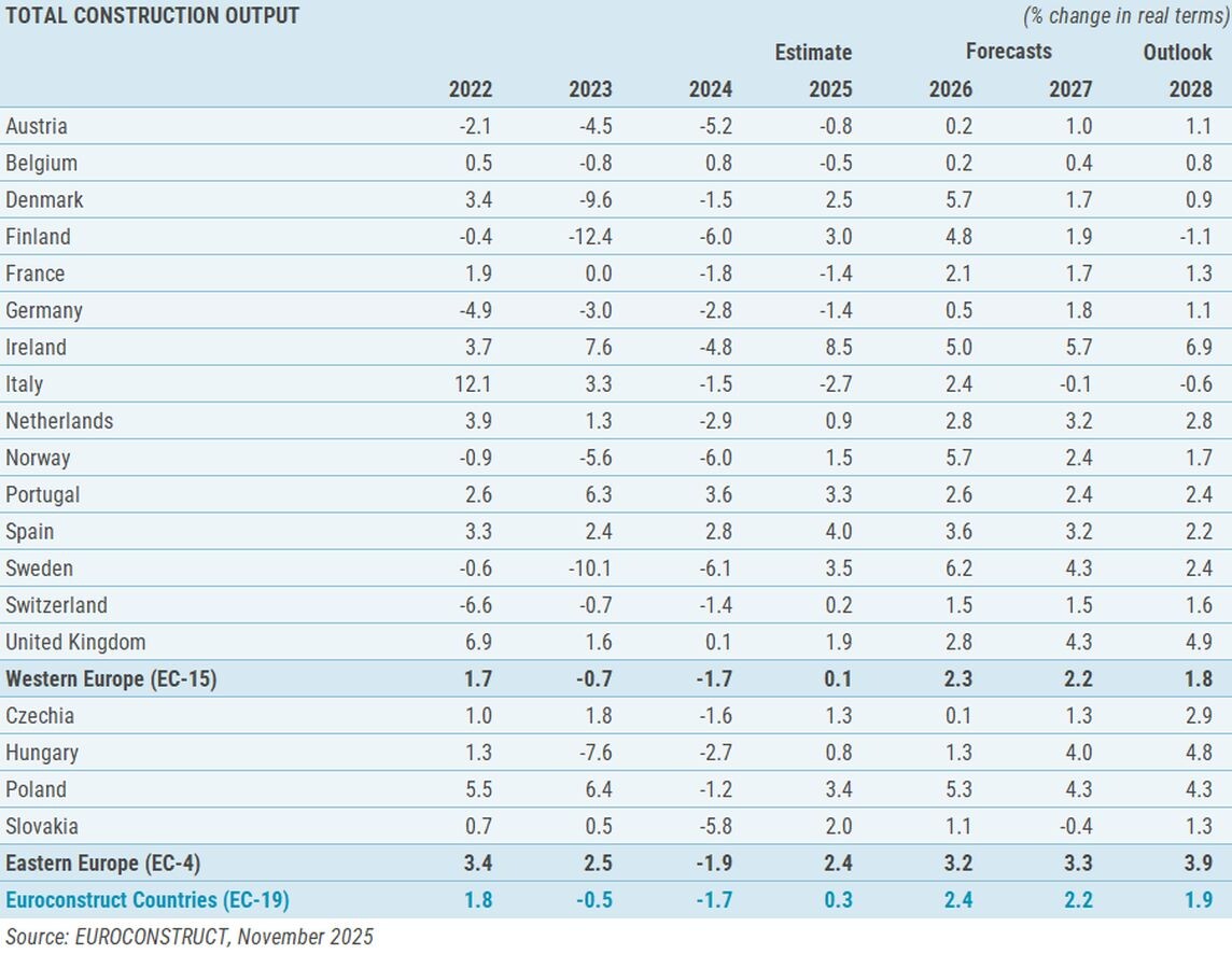 Das Euroconstruct Netzwerk erwartet somit eine schrittweise Erholung. Verbesserte Finanzierungsbedingungen, langfristige Infrastrukturprogramme und anhaltende Sanierungsaktivitäten sollen den Sektor stabilisieren und ab 2026 breiteres Wachstum ermöglichen.