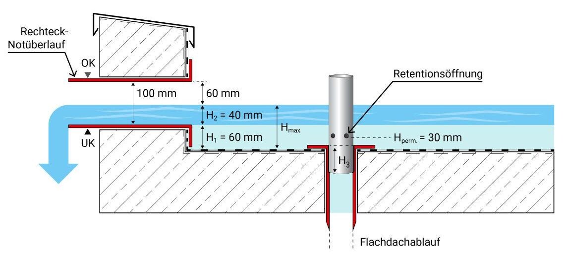 Fleck bietet eine objektspezifische Entwässerungsberechnung an. Berücksichtigt werden Dachneigung, Anzahl der Retentionsabläufe, zulässige Ablaufleistung, maximale Überflutungshöhe und Tragfähigkeit des Daches. Die Berechnung unterstützt die normgerechte Auslegung von Haupt- und Notentwässerung sowie die Dimensionierung der Retentionsmaßnahmen.